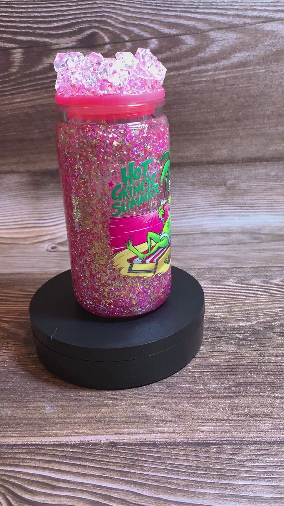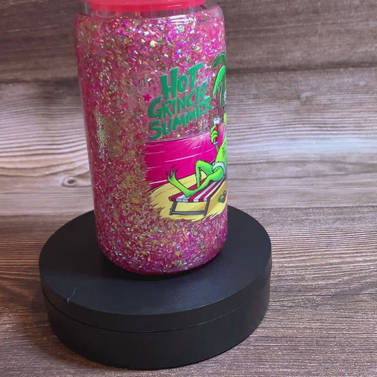 Sip in style with our Hot Grinch Snowglobe Tumbler! This 20oz tumbler features a suspended hot pink bubble glitter with a UVDTF featuring a playful spin on the classic holiday character, the green man is seen lounging under a palm tree with a cool beverage. Cheers to a quirky and fun addition to your collection!