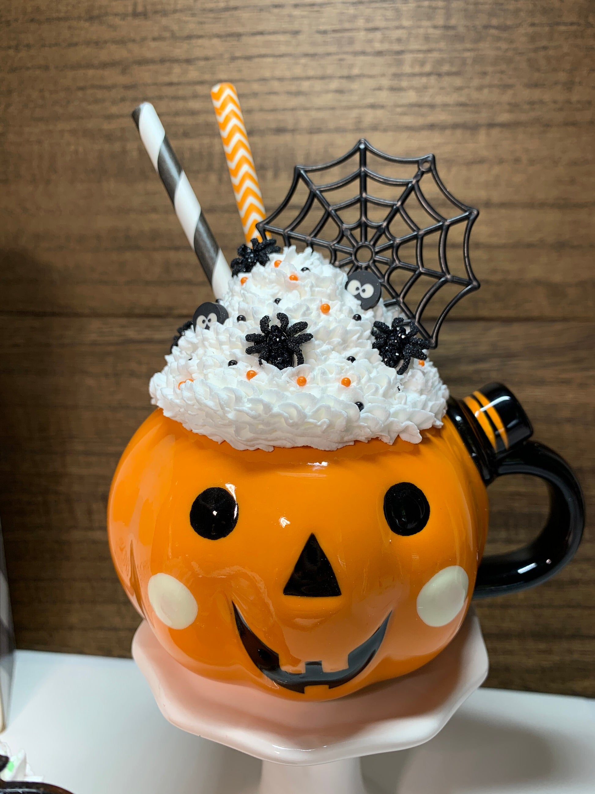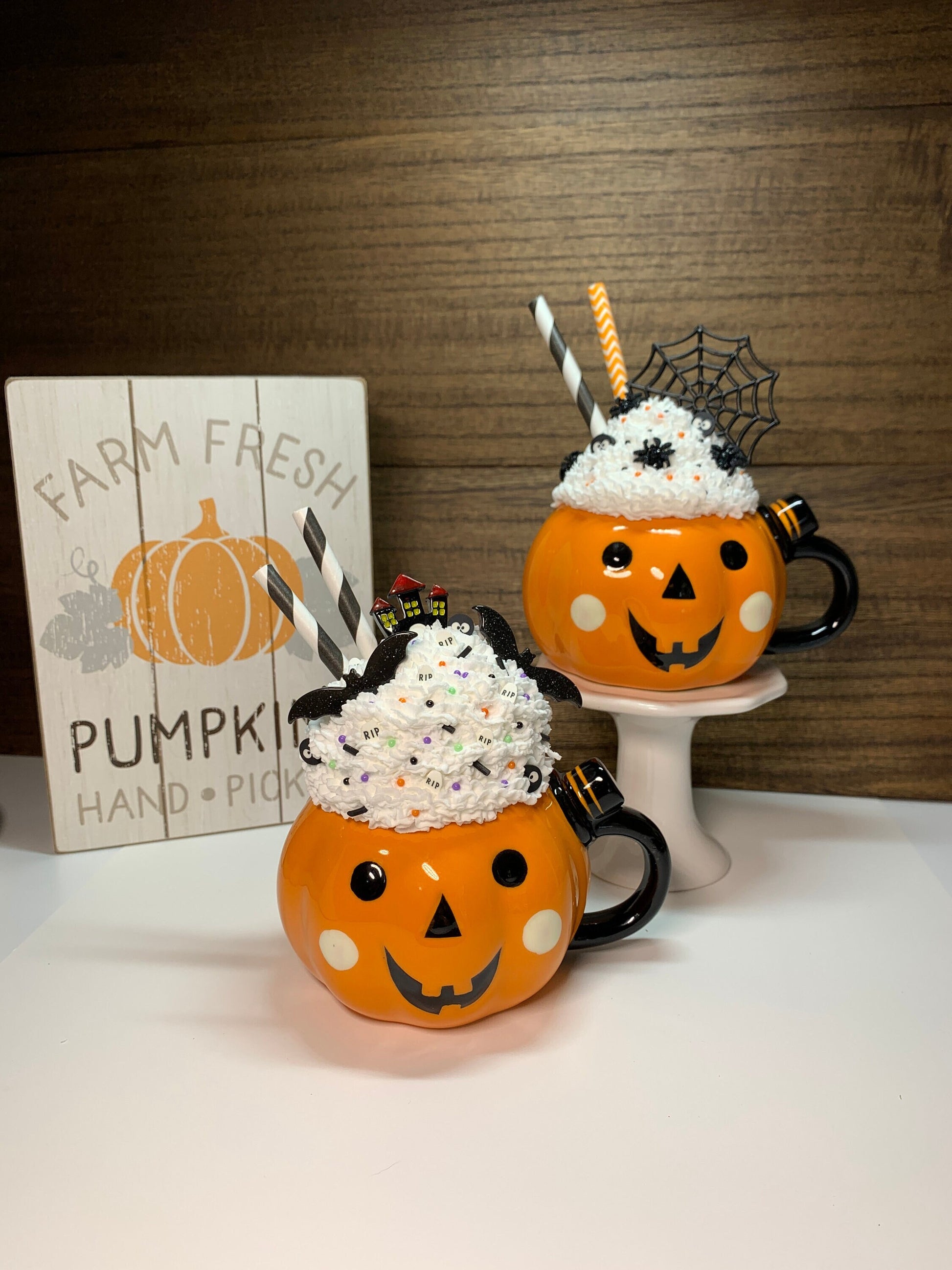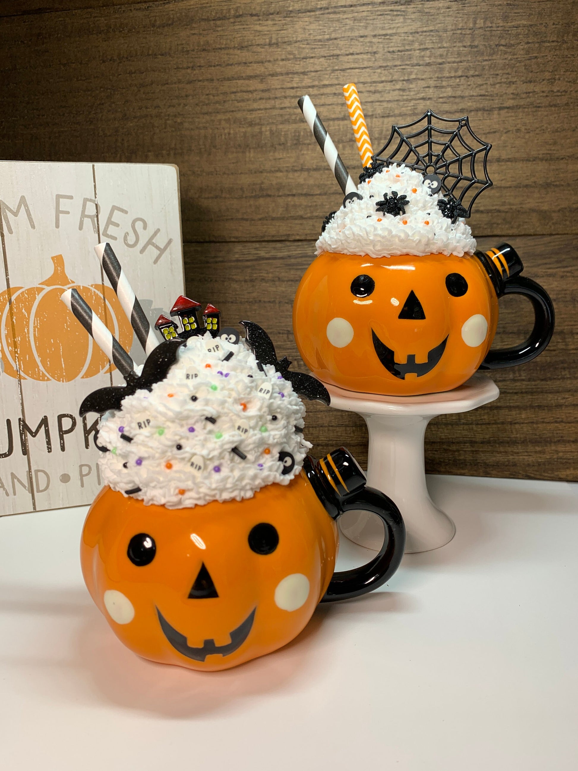 Mugs are filled with Faux Whipped Cream, decorated with two Paper Drinking straws and Resin Decorations