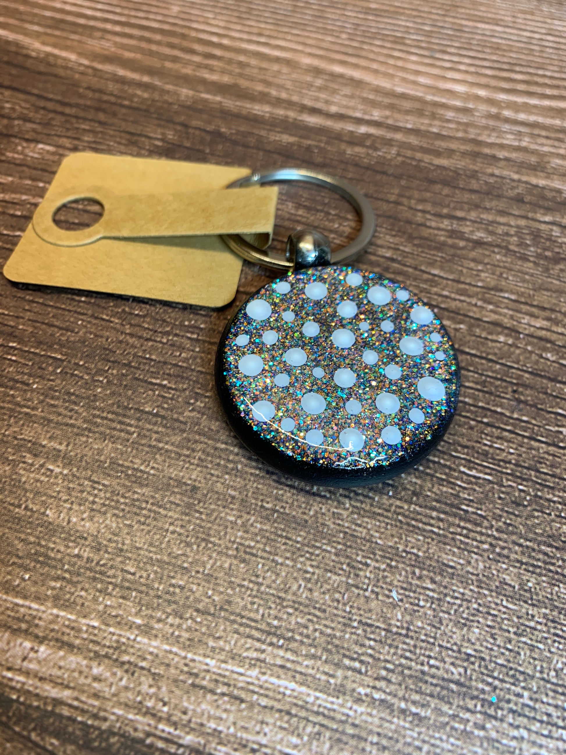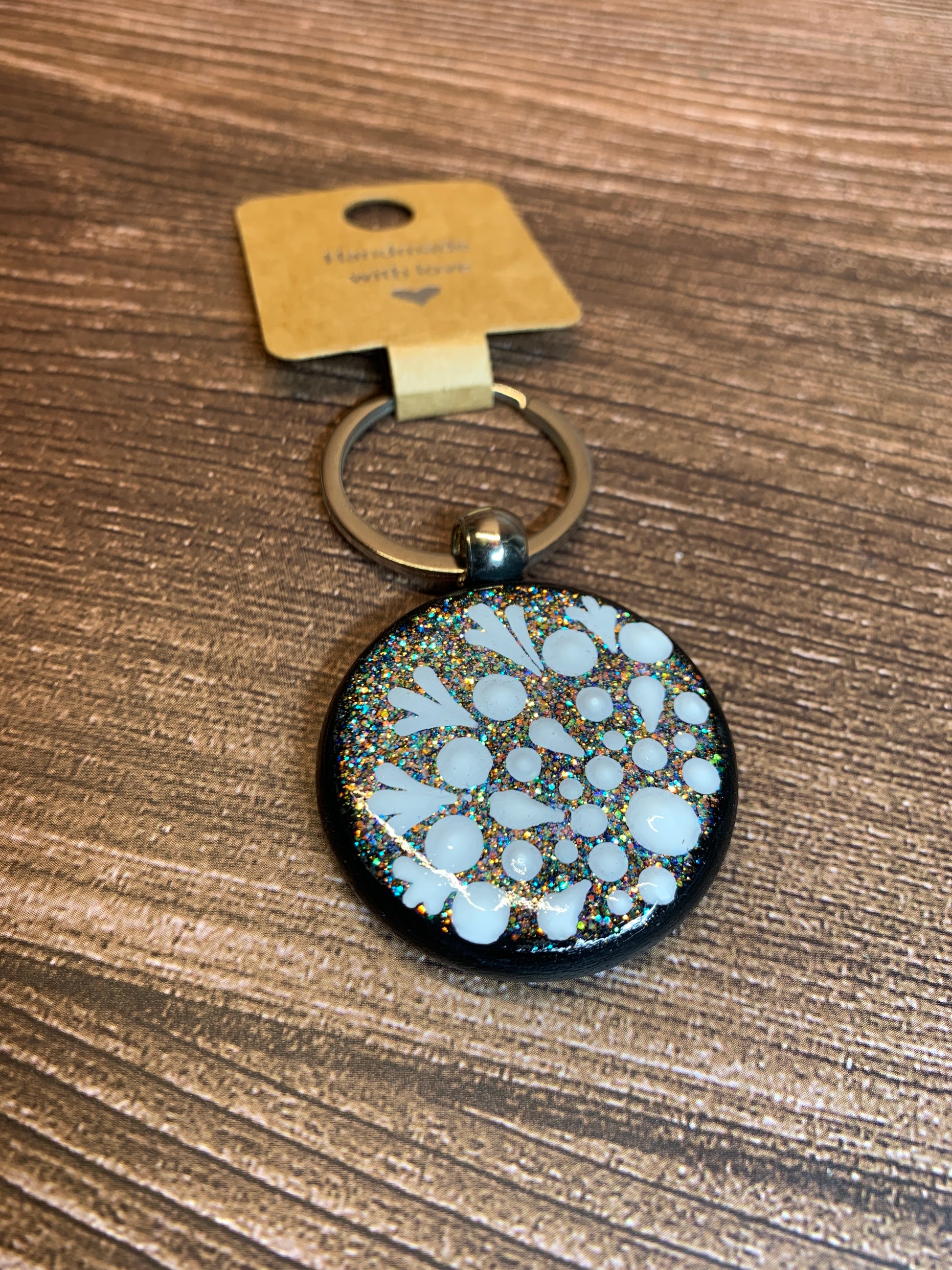 I Painted the design on this keychain using a Glittered Background and White acrylic paint.