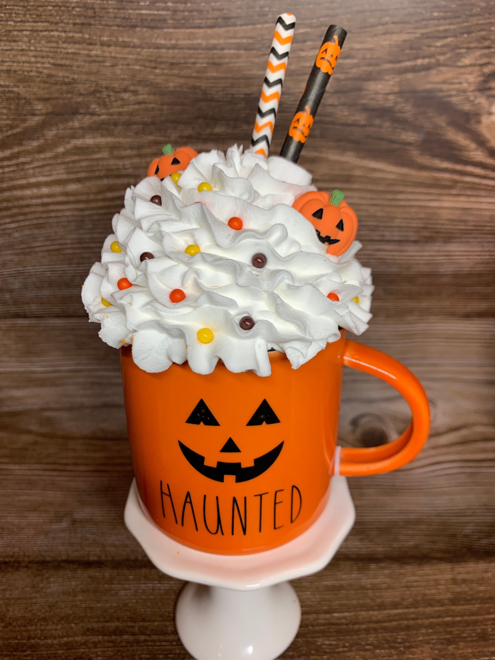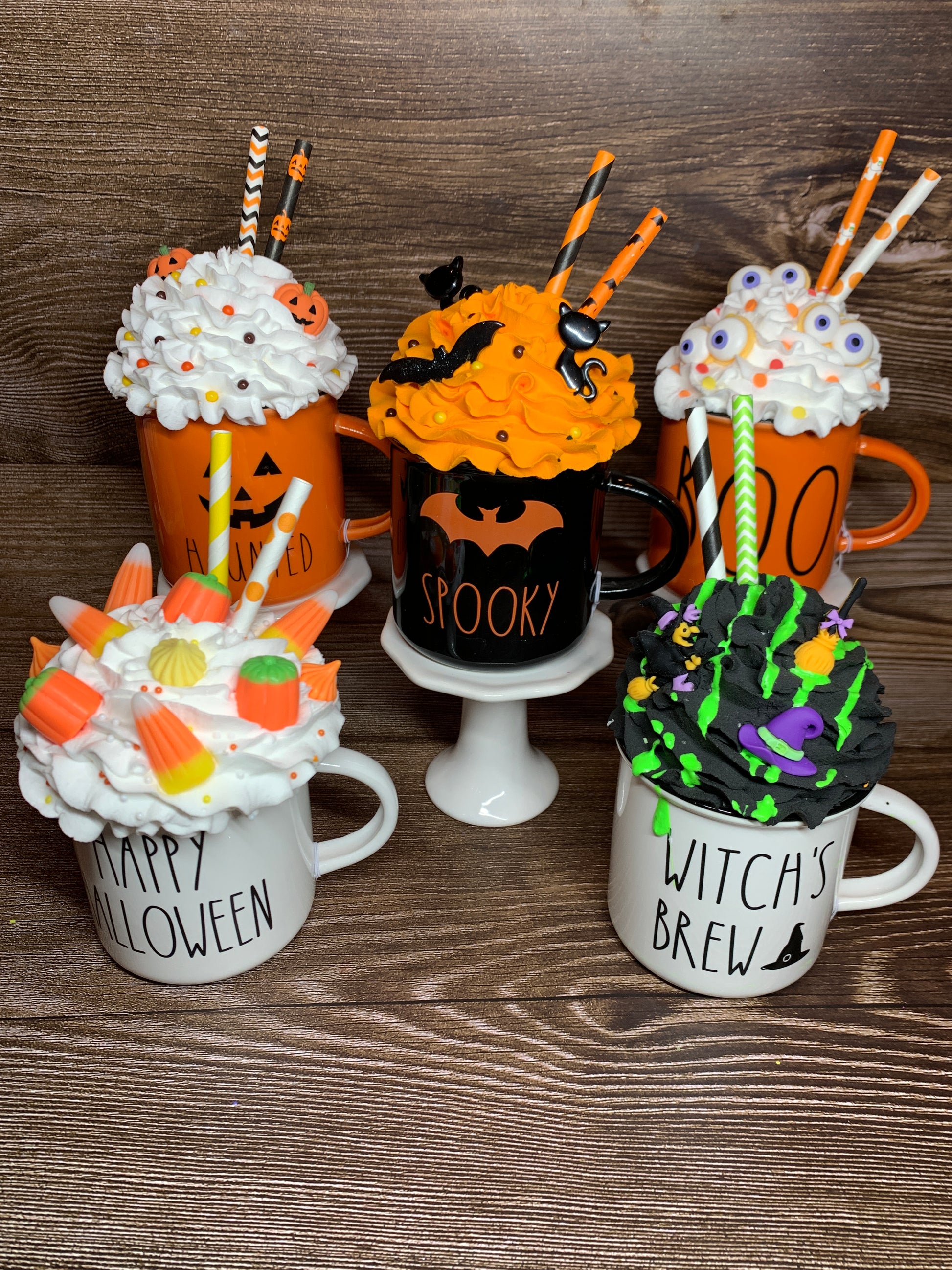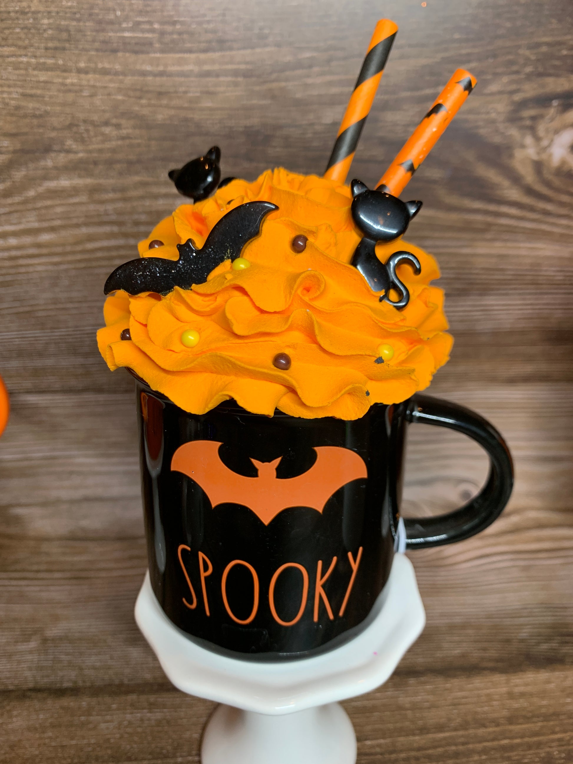 Get into the spooky spirit with these full sized Halloween themed mugs! Each mug is overflowing with faux whipped cream and adorned with polymer clay pieces and two paper straws. Perfect for adding a touch of whimsy to your Halloween decor or tier tray. (Warning: do not consume!)