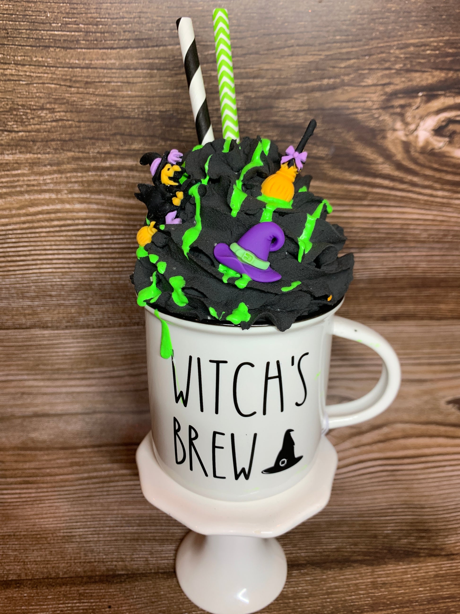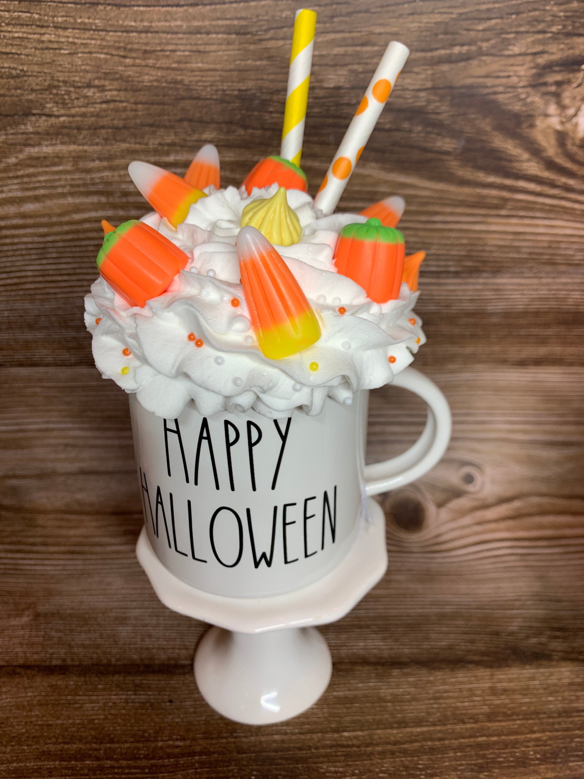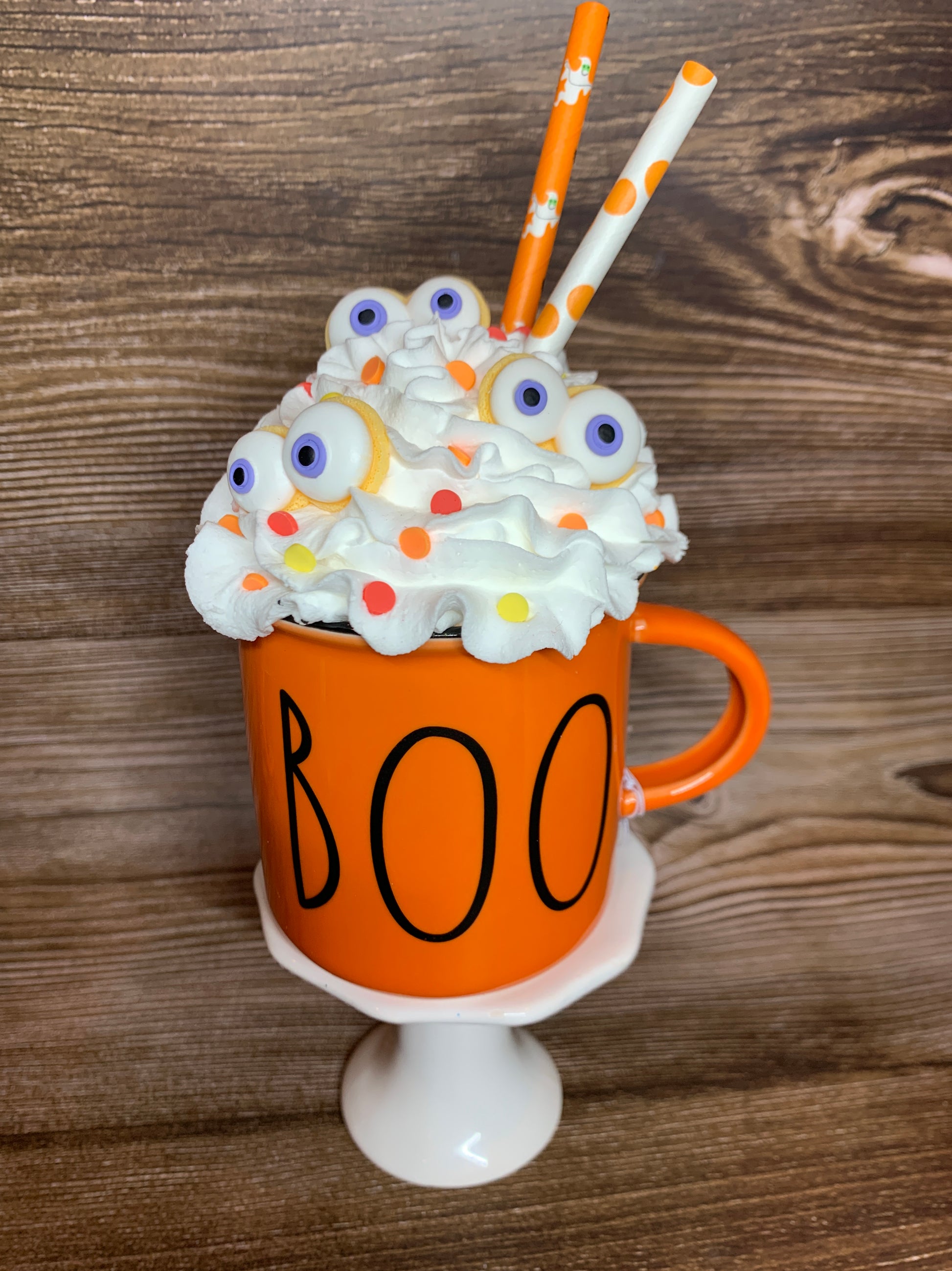 Get into the spooky spirit with these full sized Halloween themed mugs! Each mug is overflowing with faux whipped cream and adorned with polymer clay pieces and two paper straws. Perfect for adding a touch of whimsy to your Halloween decor or tier tray. (Warning: do not consume!)