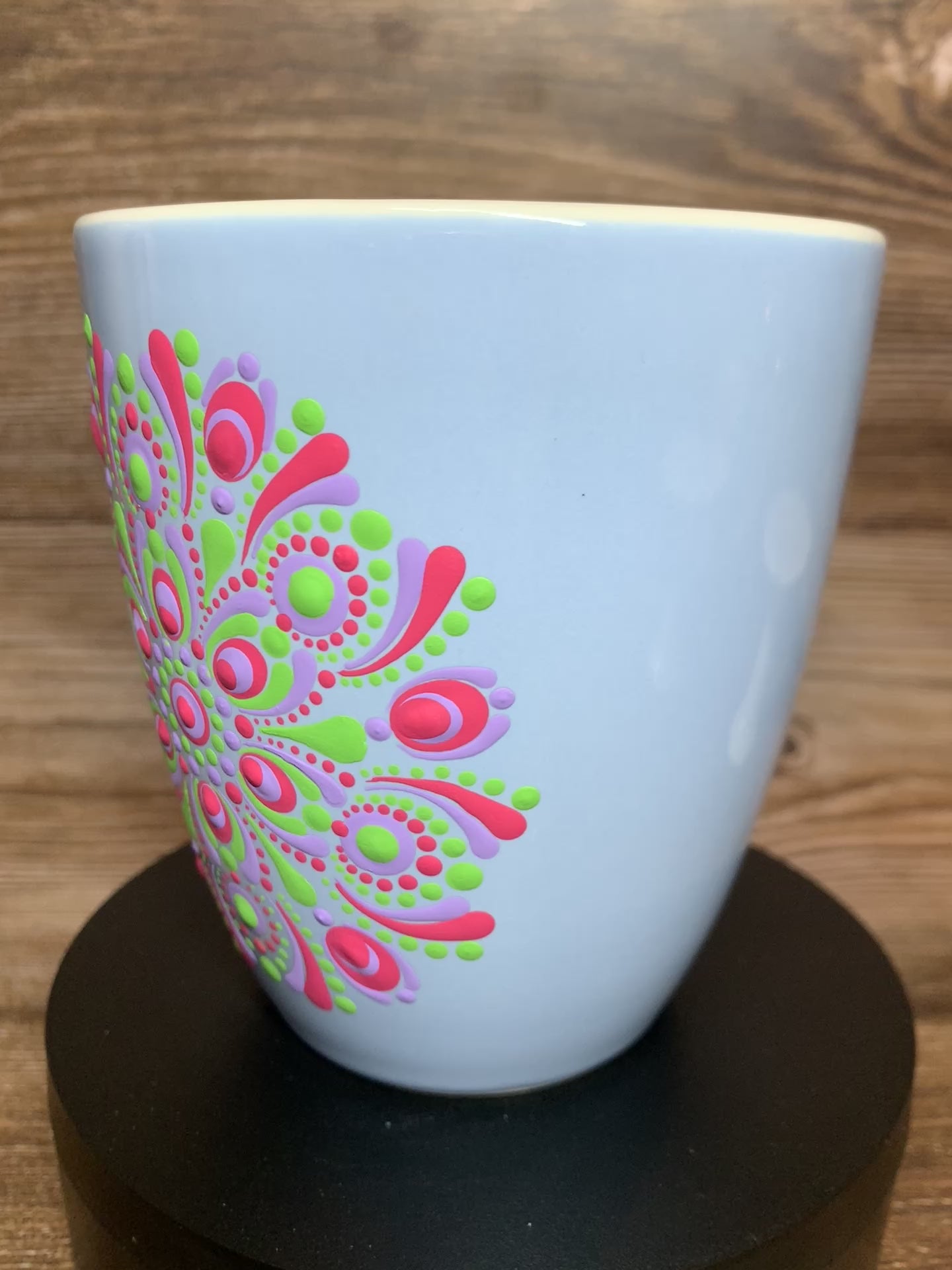 Start your day off with a touch of whimsy with our light blue Mug. This porcelain mug features a large handle for easy and comfortable use. The mug has a dot art design in dark pink, light purple, and apple green matte acrylic paints.