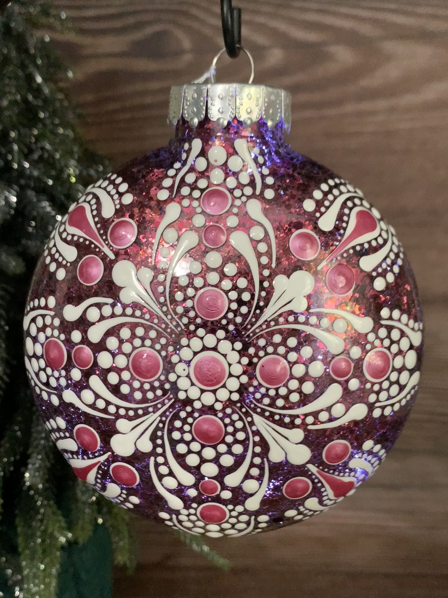 This Disc Ornament was treated with a Medium Burgundy Glitter coating on the inside and Metallic Rose & White Acrylic Paint on the exterior to create the dotted mandala design.