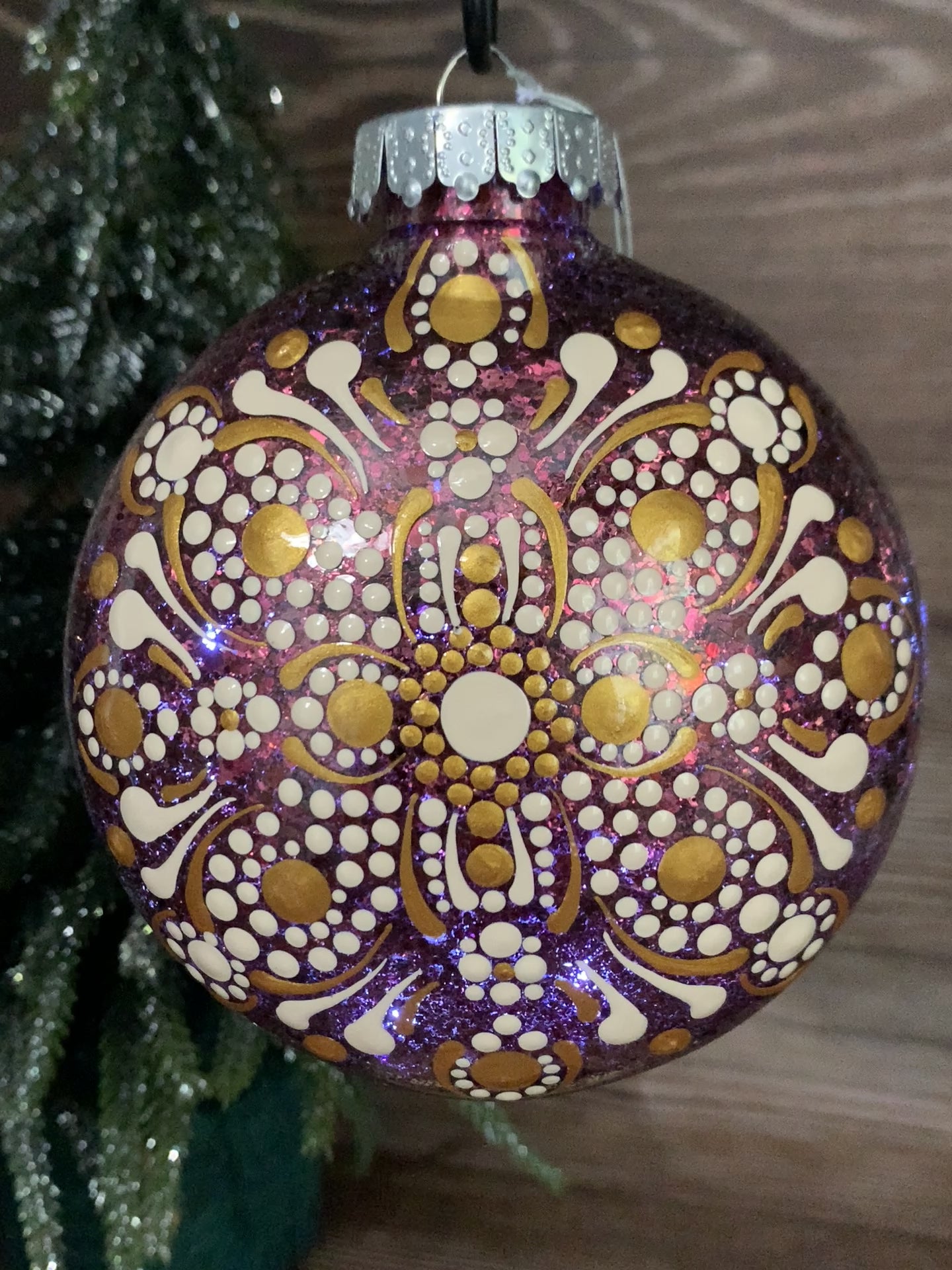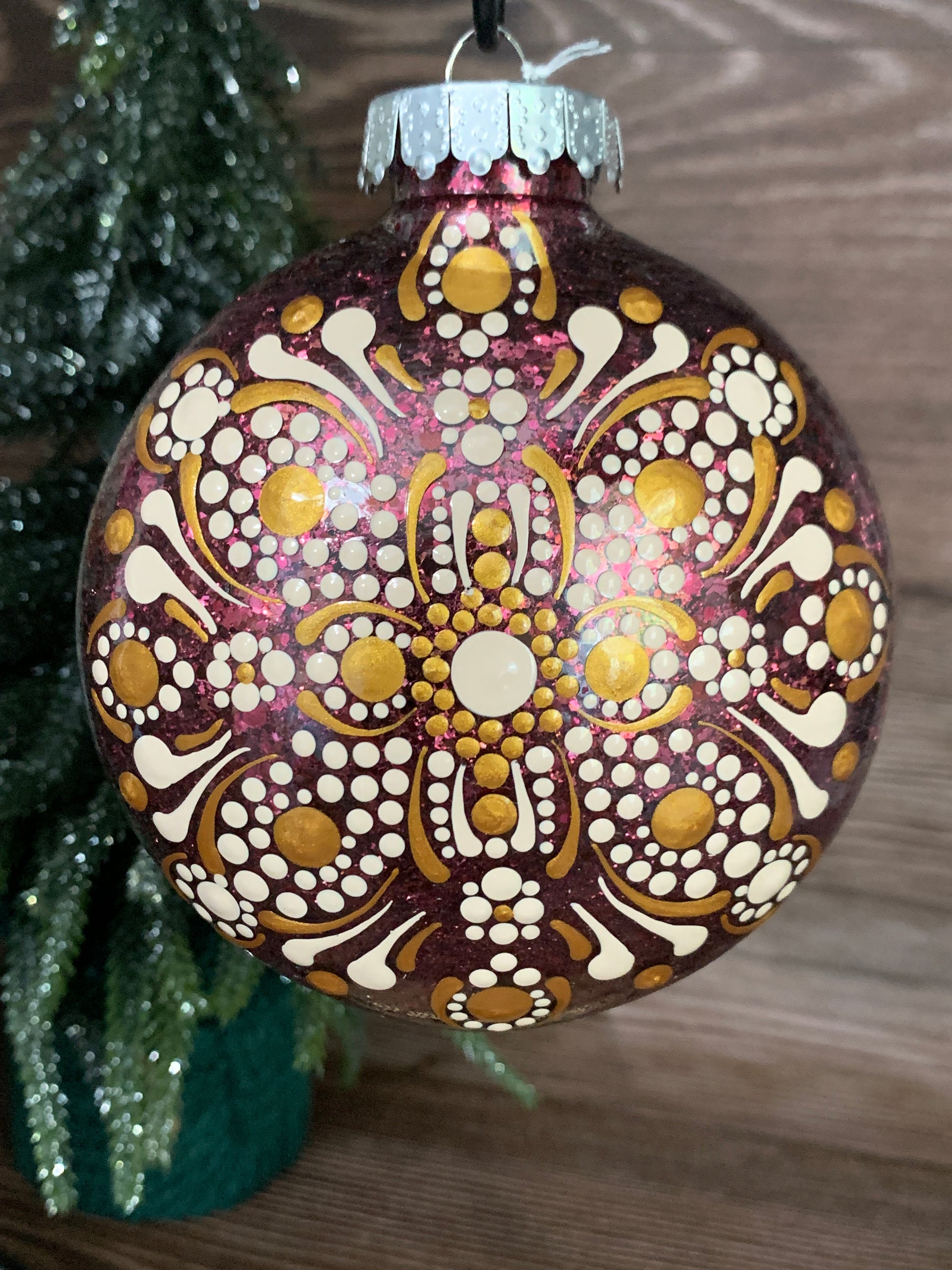 This Disc Ornament was treated with a Medium Chunky Glitter coating on the inside and Gold & Cream Acrylic Paint on the exterior to create the dotted mandala design.