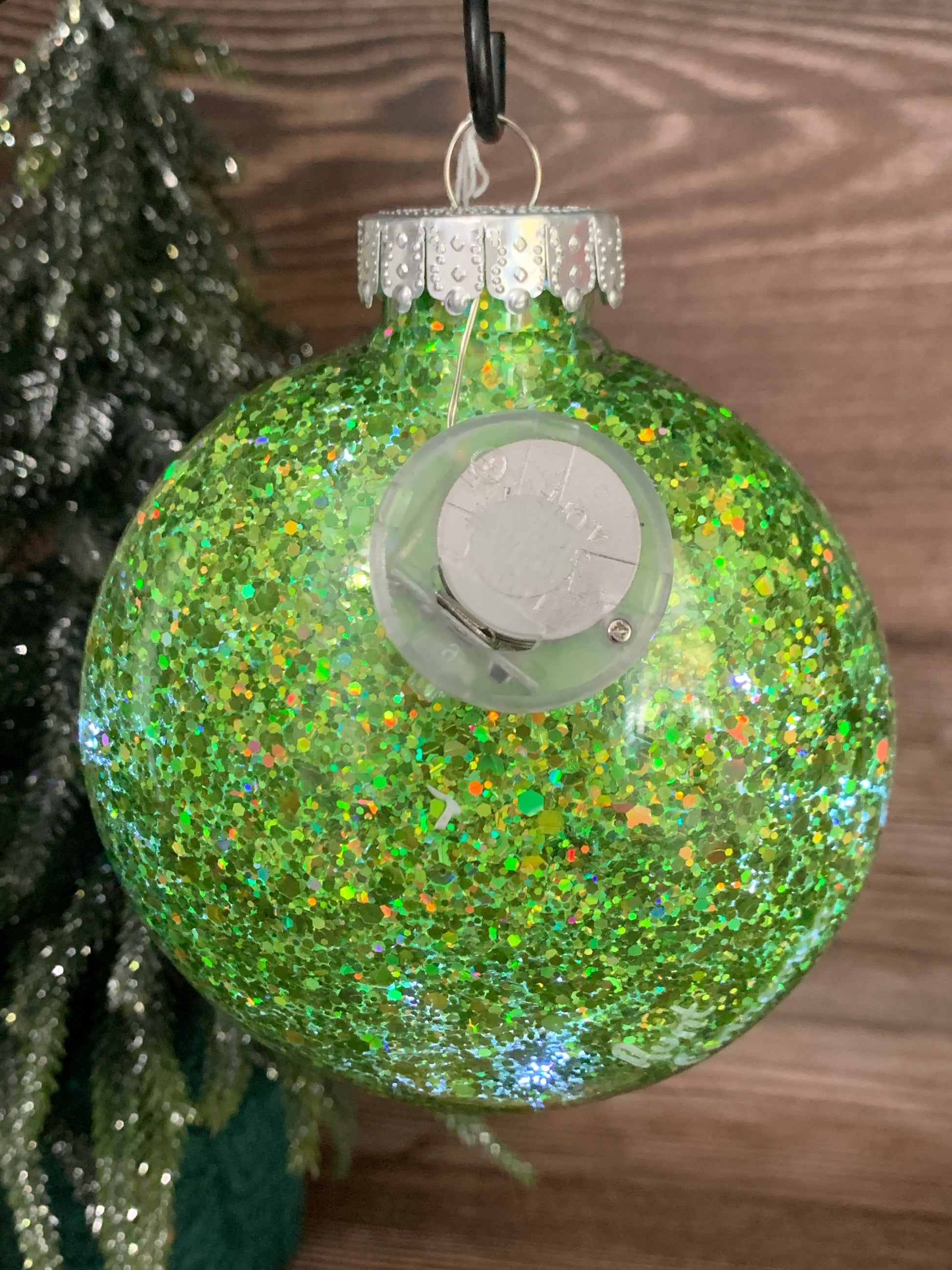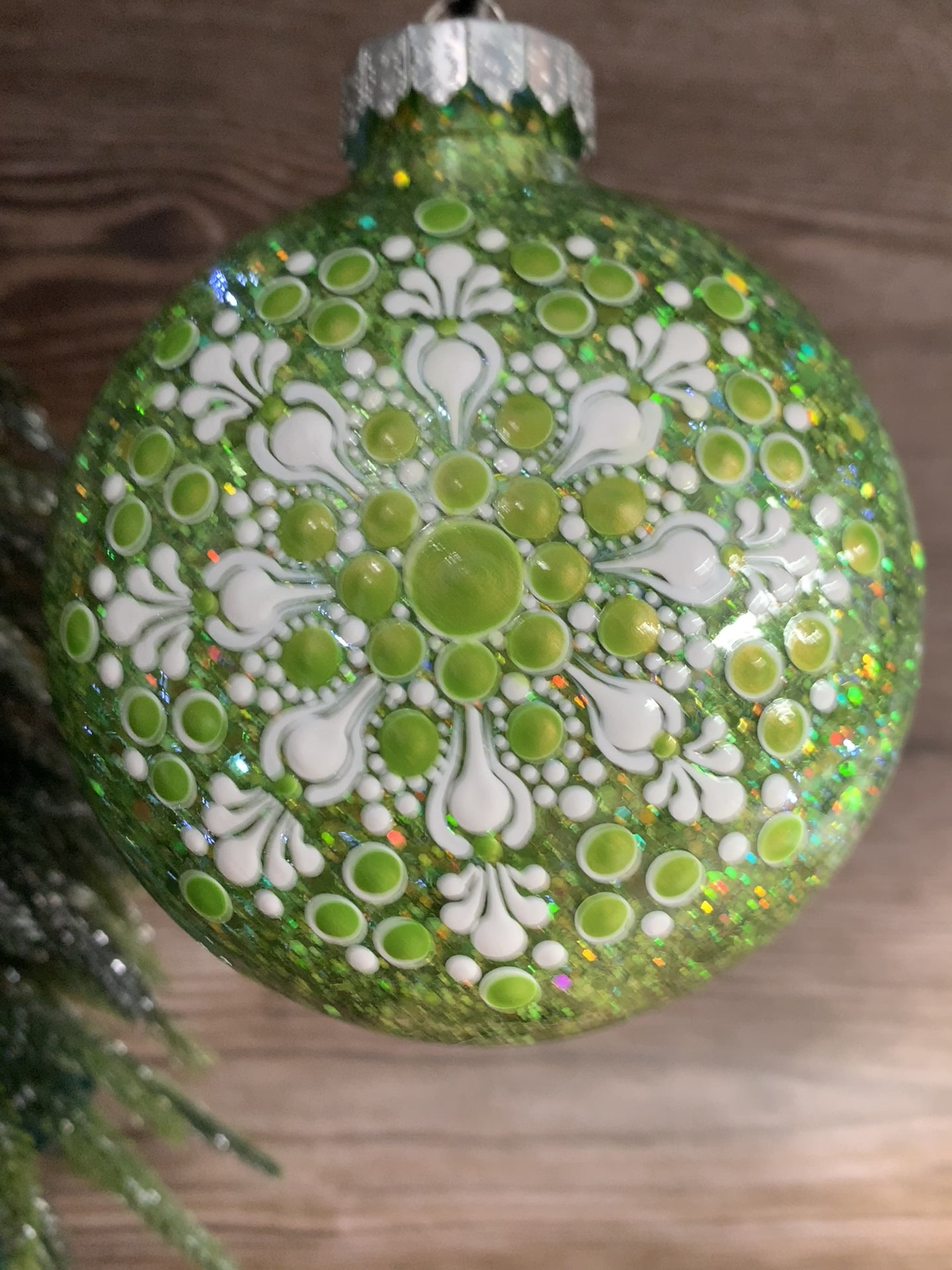 This Disc Ornament was treated with a Chunky Green Glitter coating on the inside and Green Metallic & White Acrylic Paint on the exterior to create the dotted mandala design.