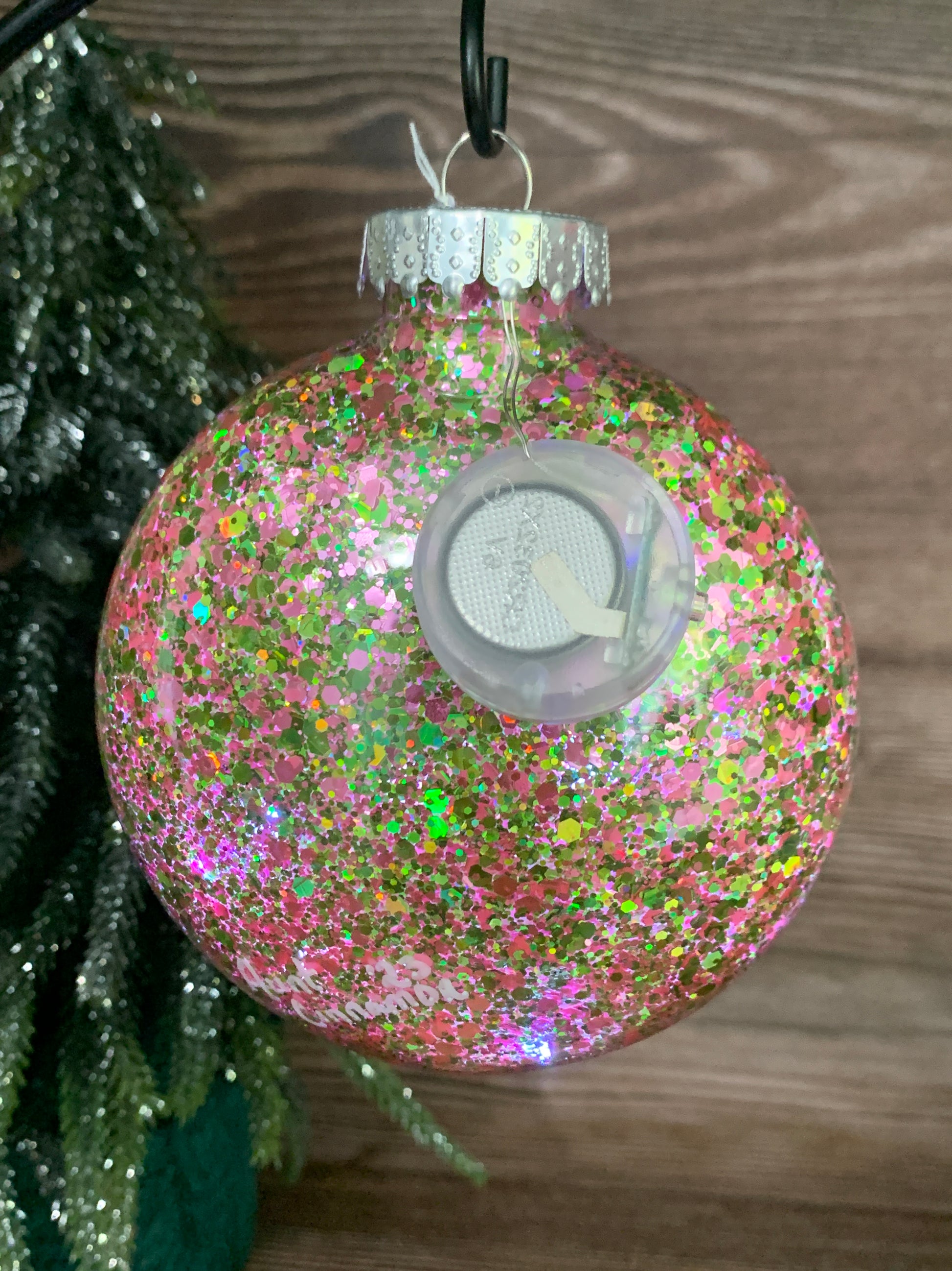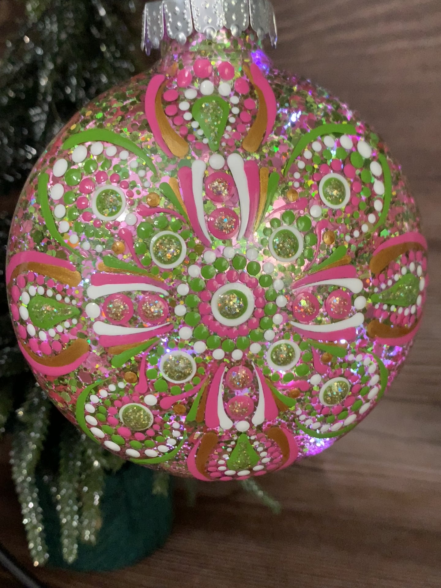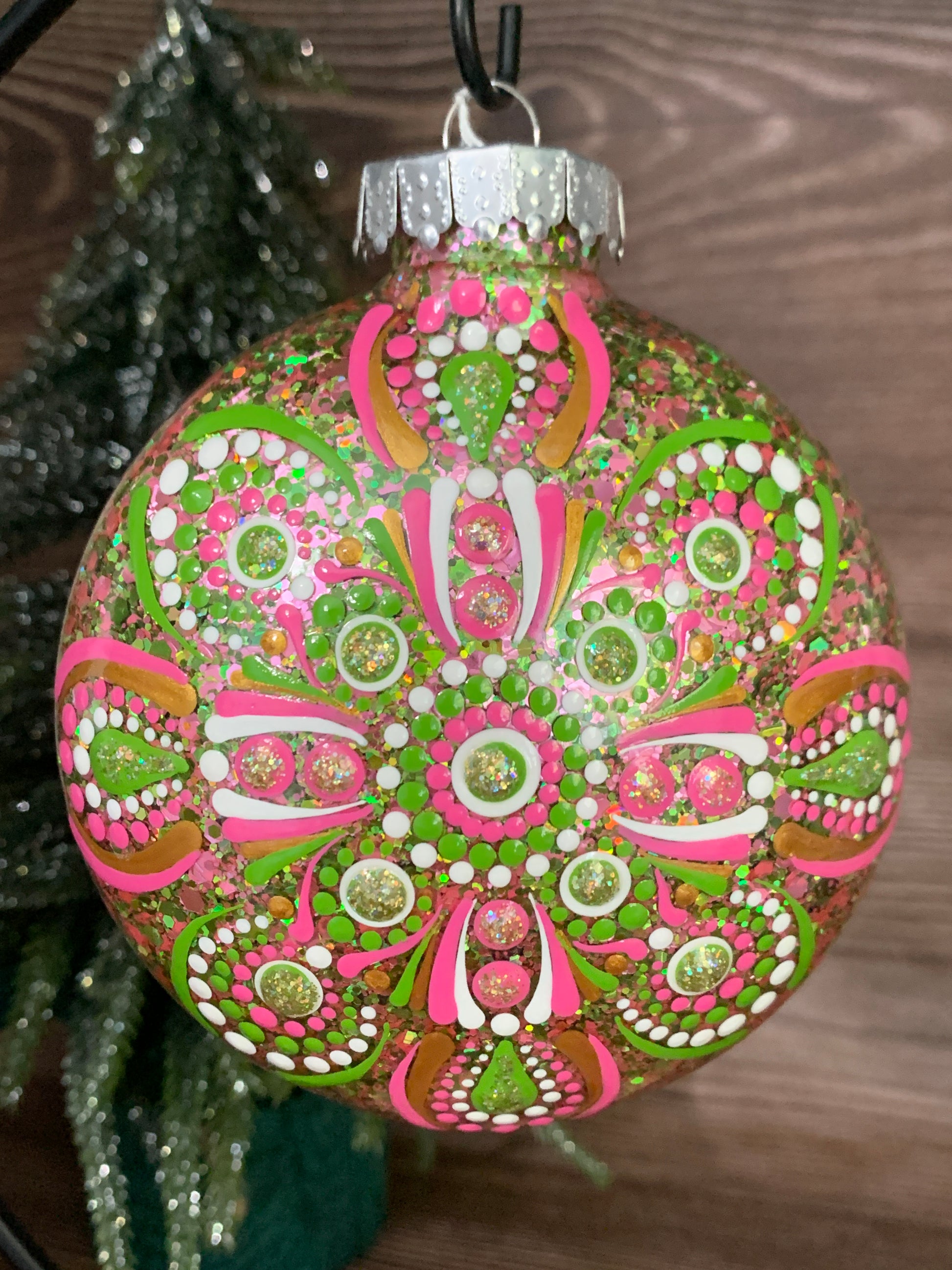 This Disc Ornament was treated with a Chunky Pink & Green Glitter coating on the inside and a Purple/Blue color shift & White Acrylic Paint on the exterior to create the dotted mandala design.