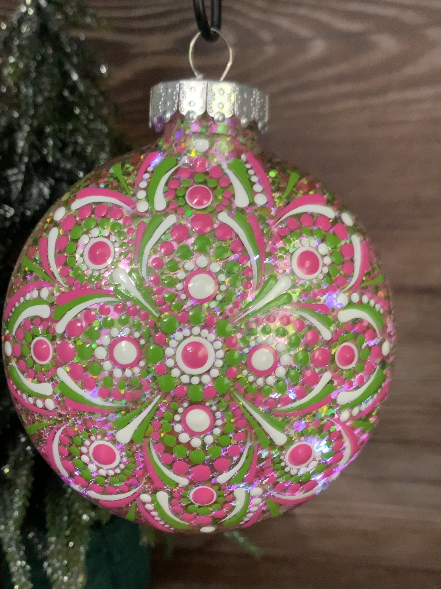 This Disc Ornament was treated with a Chunky Green & Pink Glitter coating on the inside and Pink, Green & White Acrylic Paint on the exterior to create the dotted mandala design.