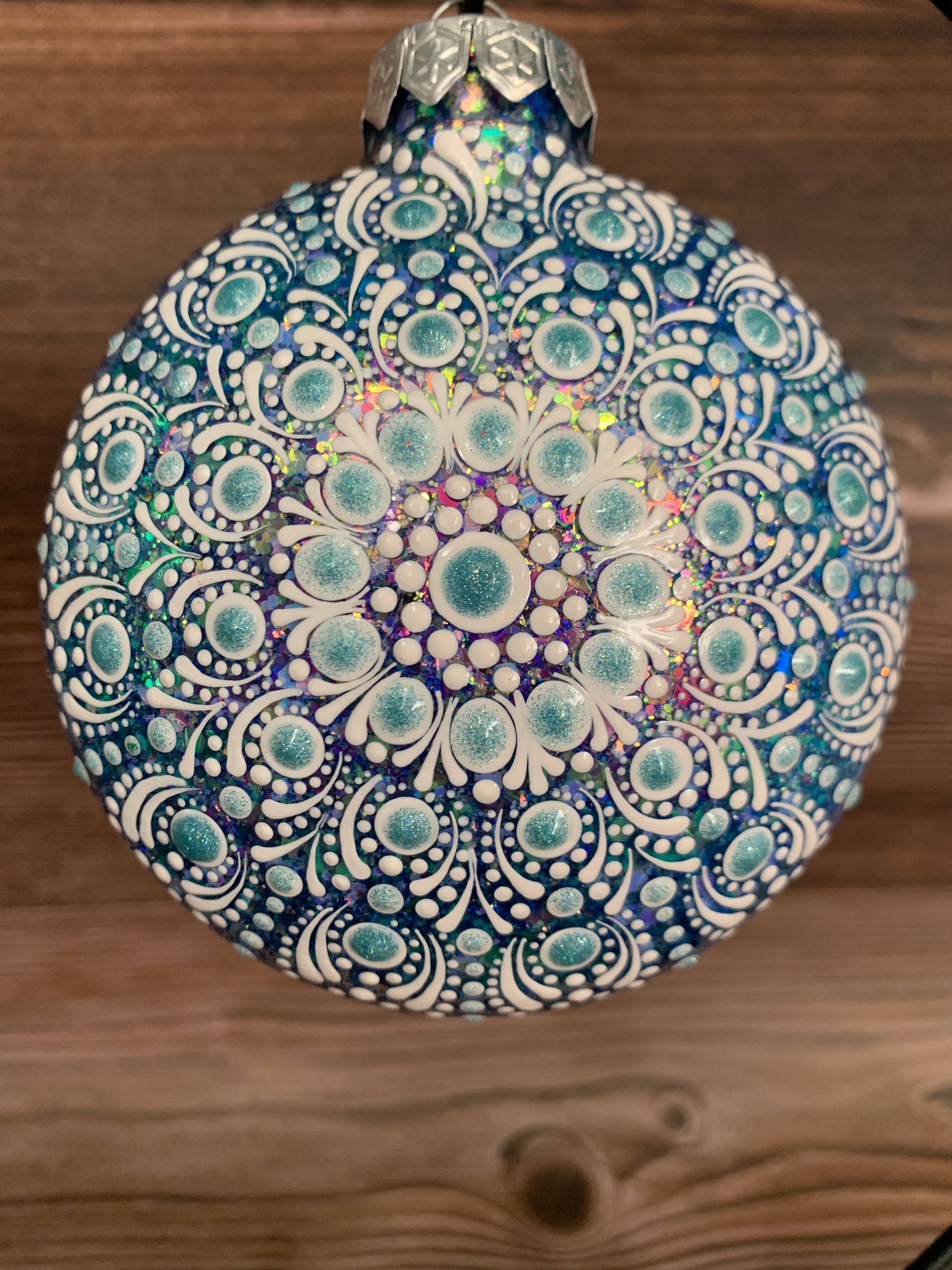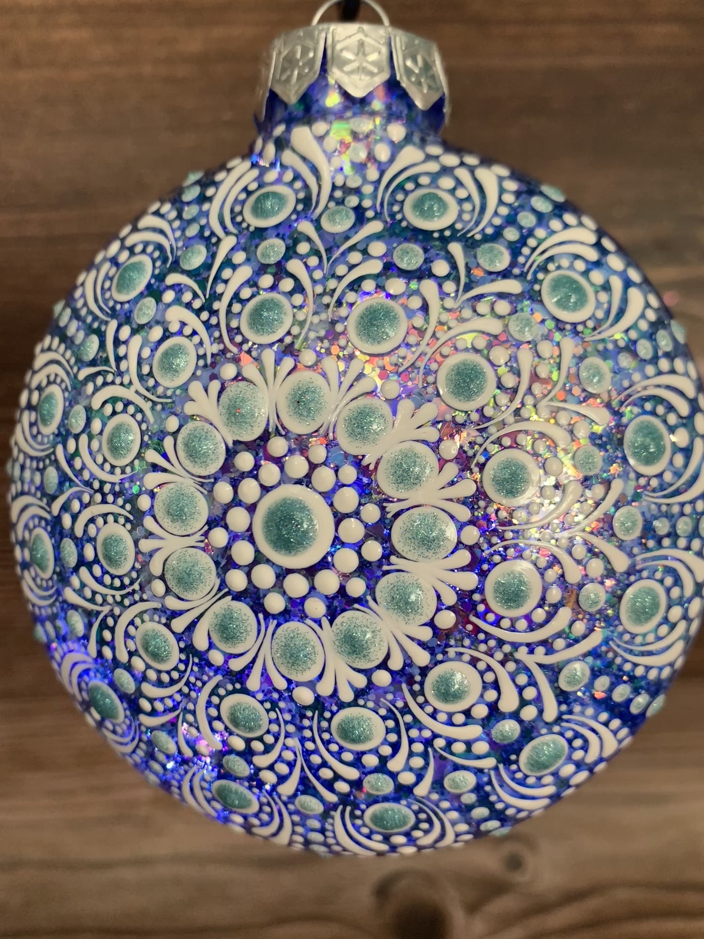 This Disc ornament has a custom blue purple color shift glitter coating on the inside with white dots and swooshes that have been top dotted with glittery dimensional paint to make up the design.