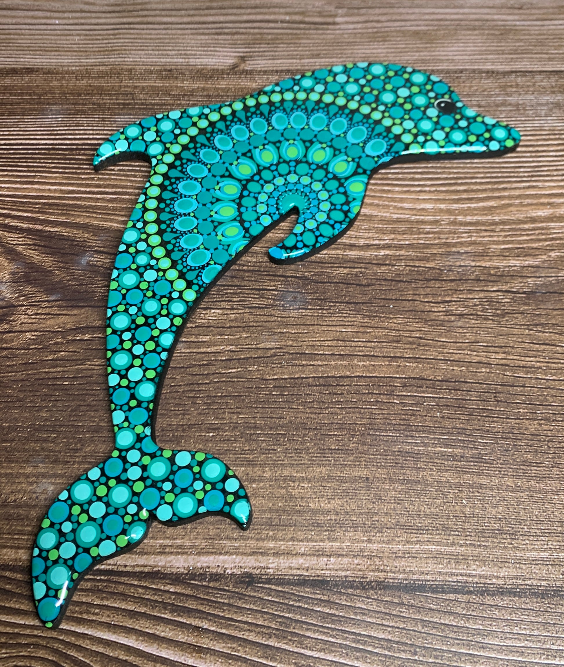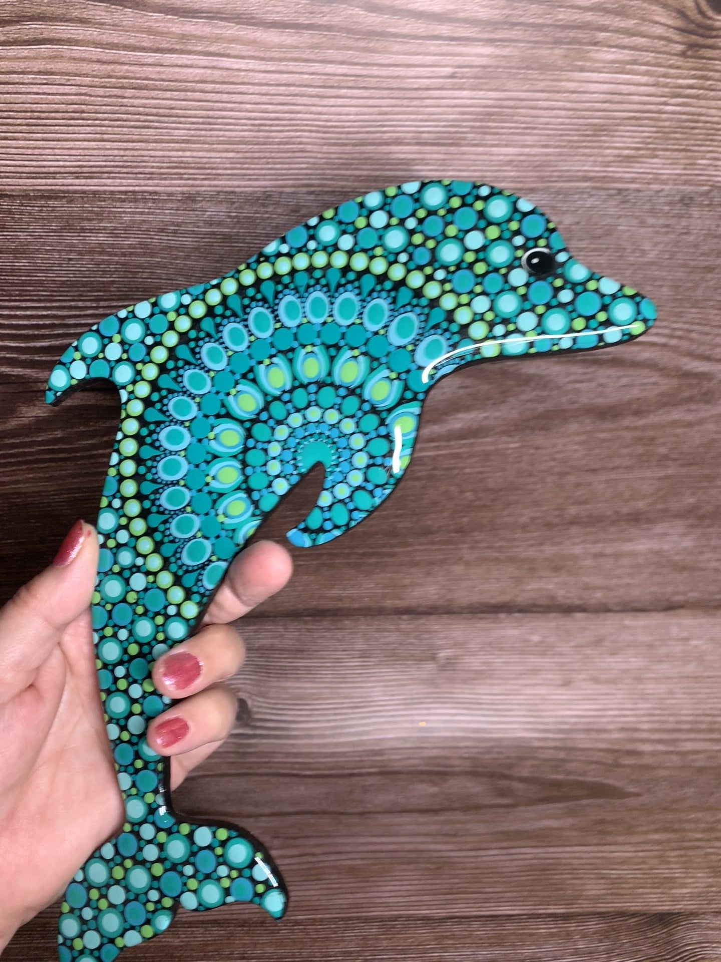 This Dolphin has been painted with a black background, I then created the mandala design using Aqua, Teal, light Turquoise, Apple Green, light acrylic paints.