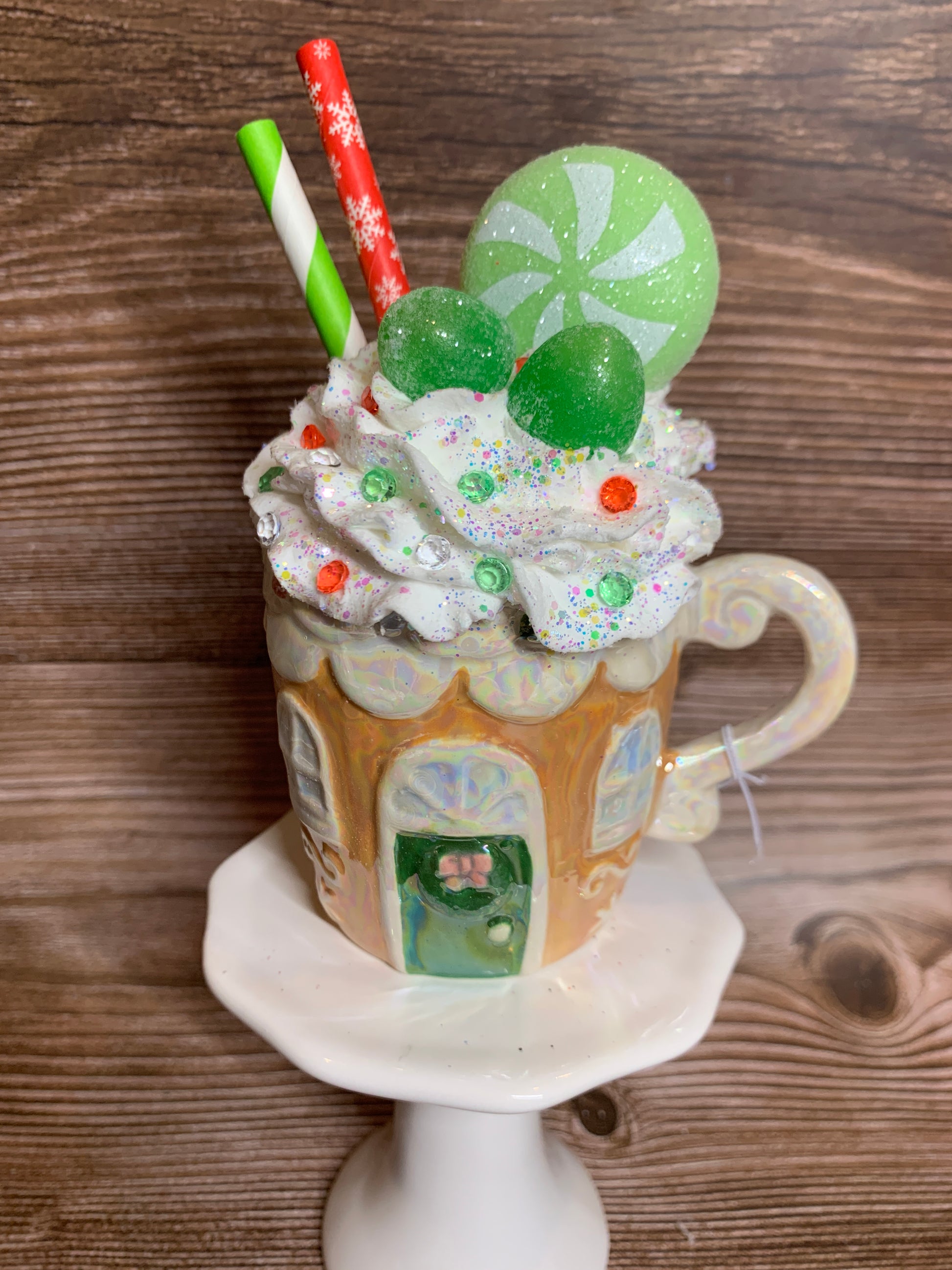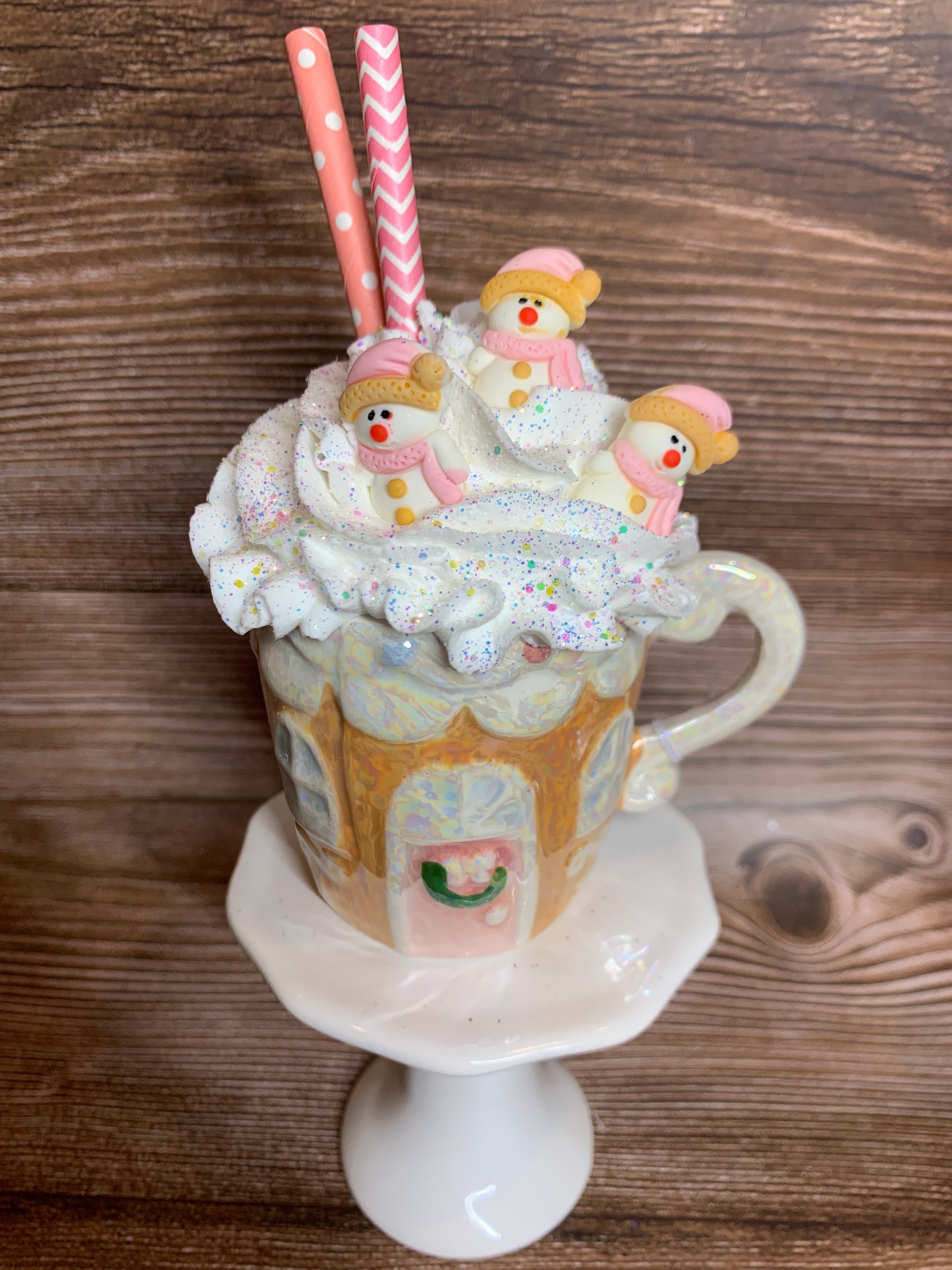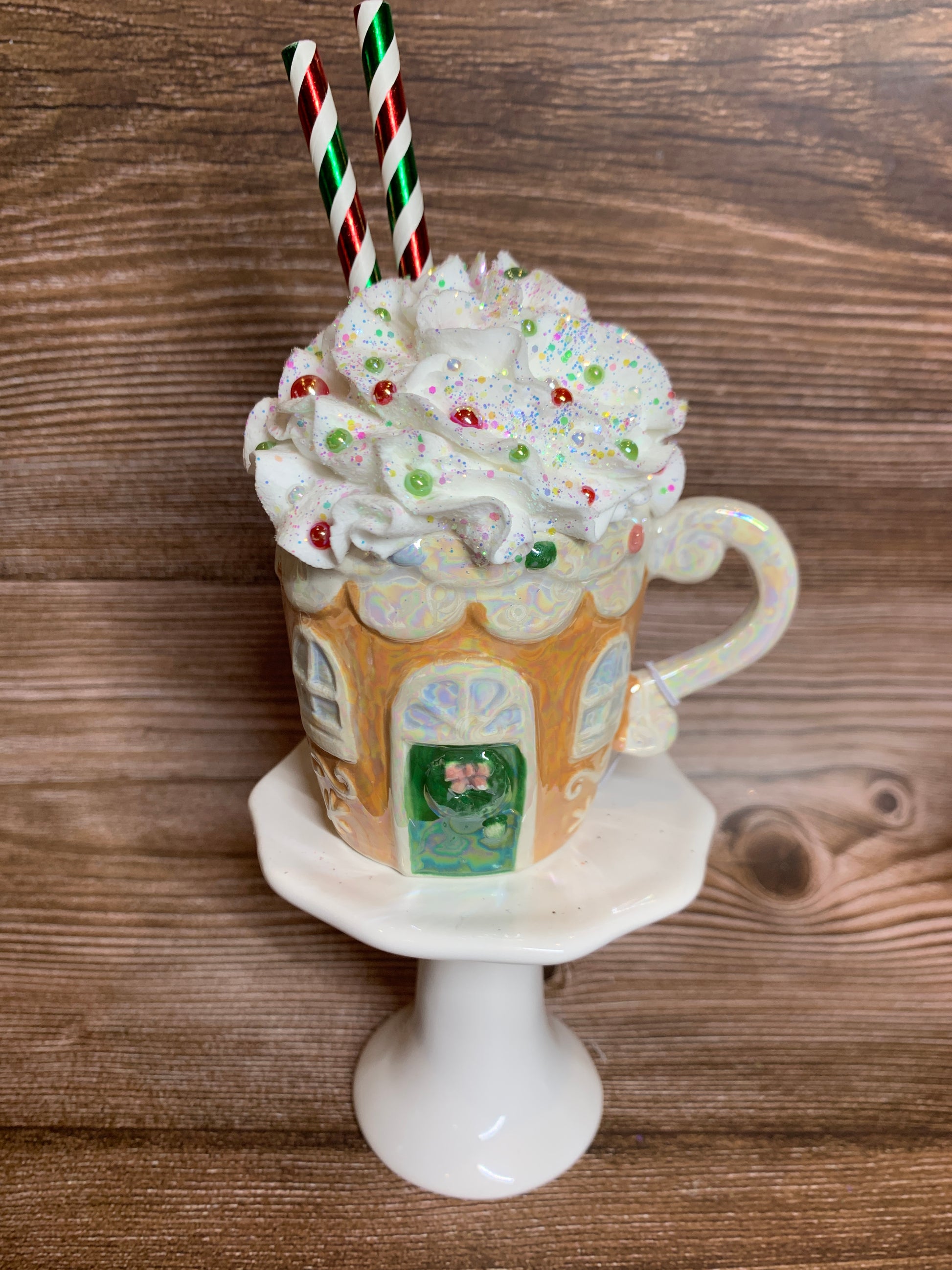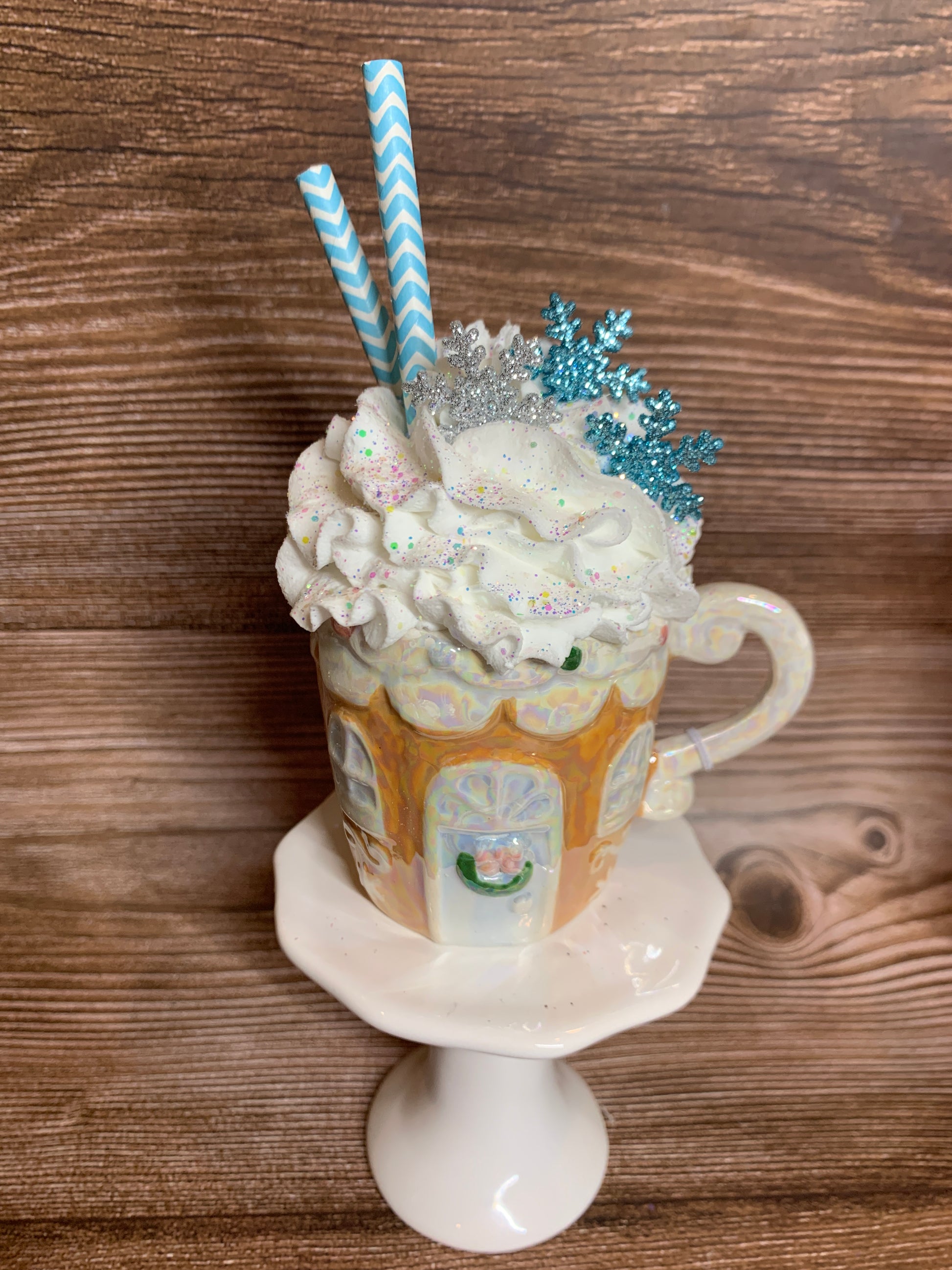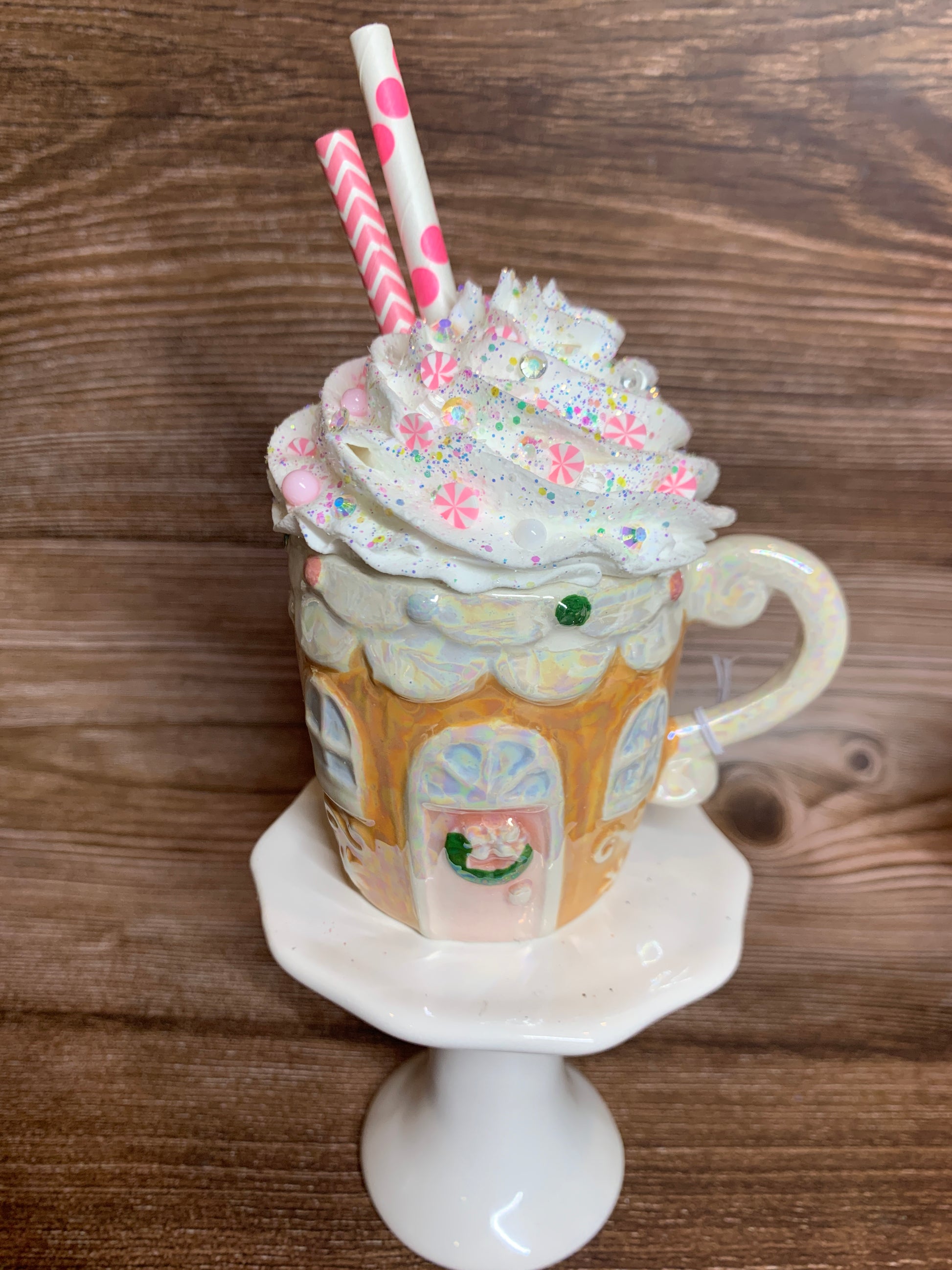 Add a festive touch to your tier tray decor or hot chocolate bar with these beautiful opal ceramic Gingerbread House mini mugs. Overflowing with faux whipped cream, sprinkled with glitter, and decorated with polymer clay pieces, glittered stars, opal pearls and paper straws, these mini mugs are sure to bring a smile to your face. (Note: Not for actual use.)