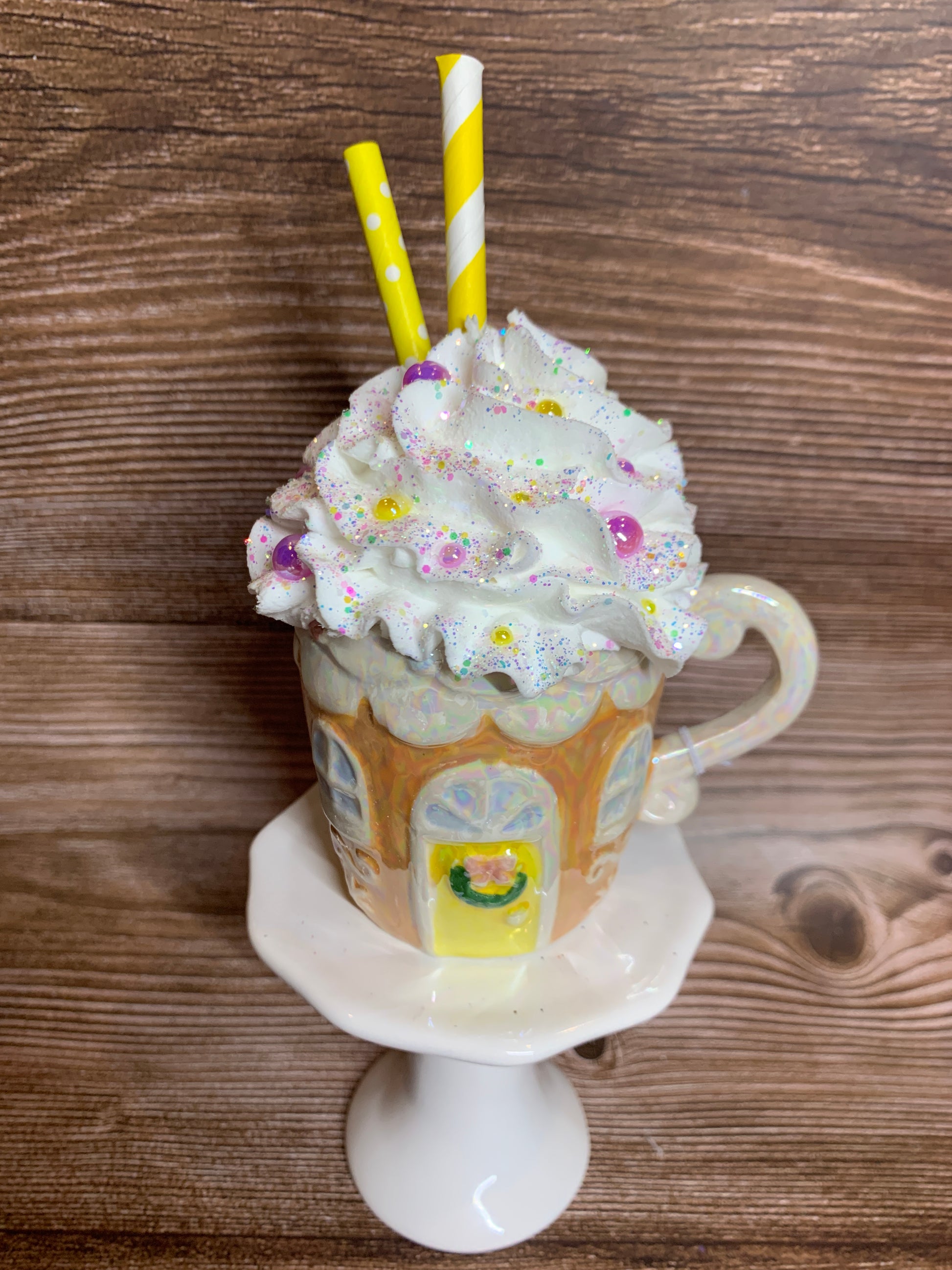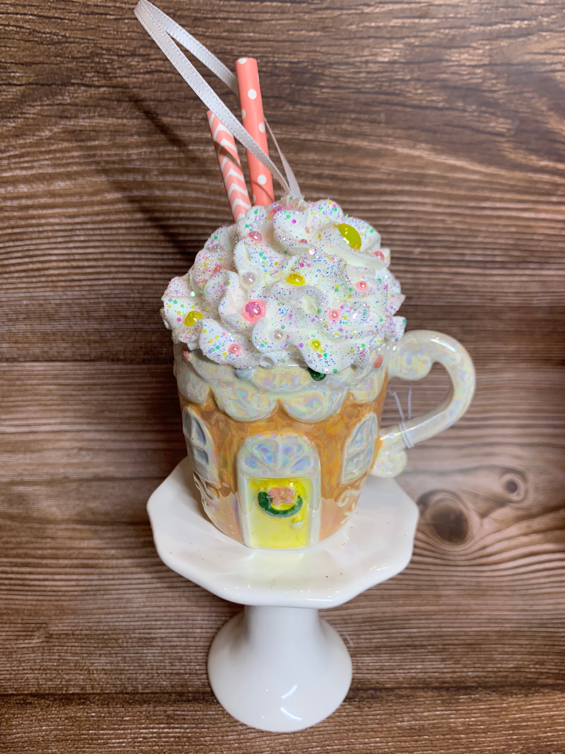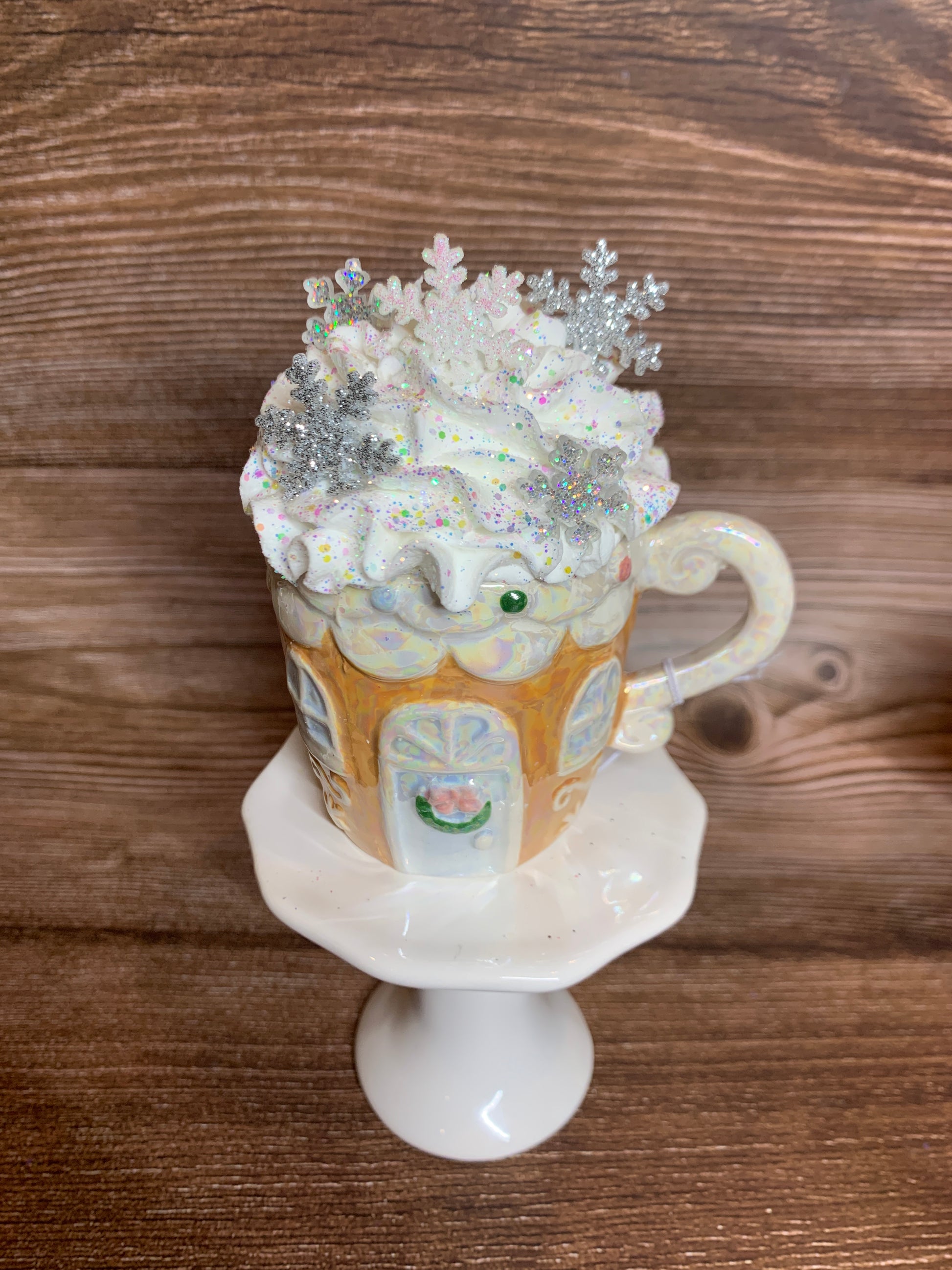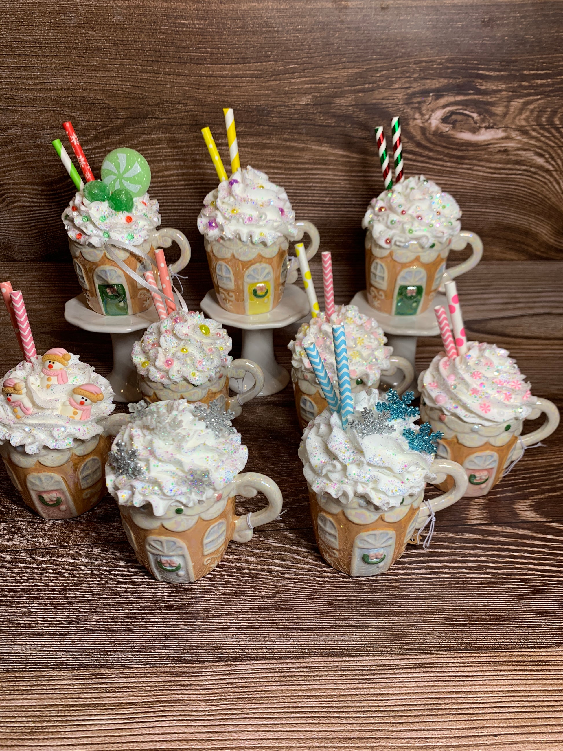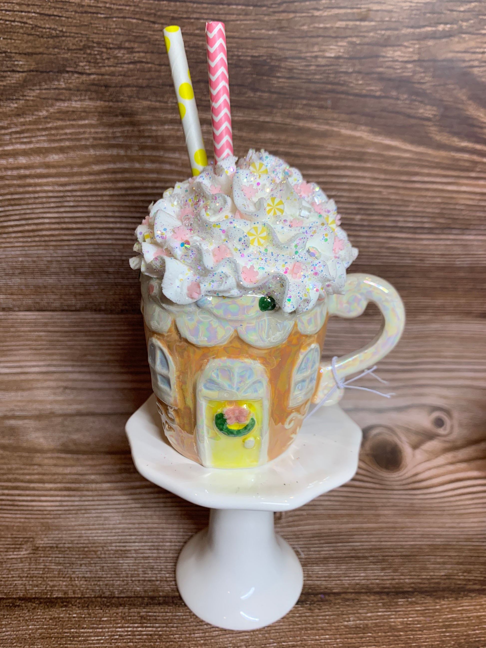 Add a festive touch to your tier tray decor or hot chocolate bar with these beautiful opal ceramic Gingerbread House mini mugs. Overflowing with faux whipped cream, sprinkled with glitter, and decorated with polymer clay pieces, glittered stars, opal pearls and paper straws, these mini mugs are sure to bring a smile to your face. (Note: Not for actual use.)
