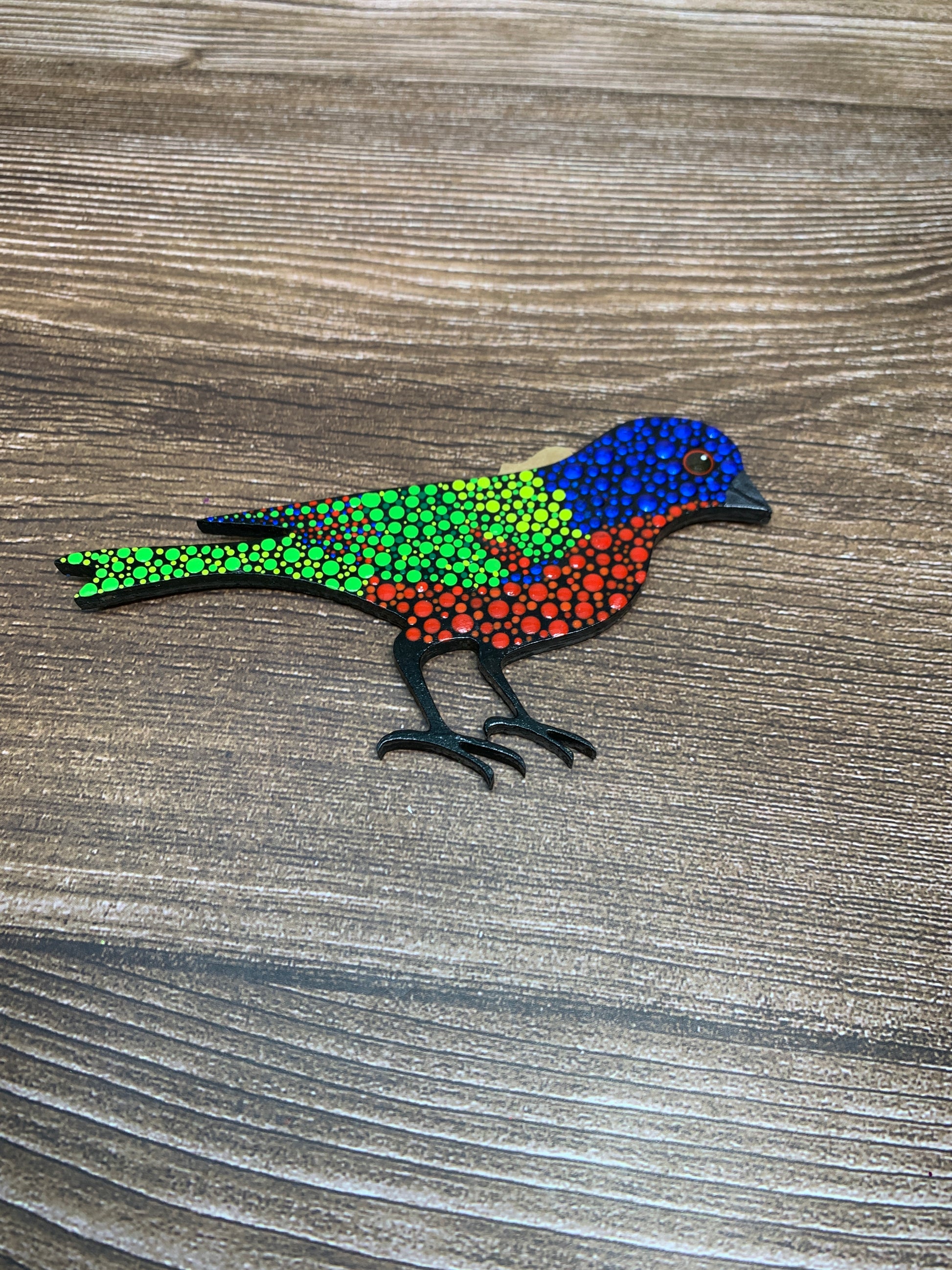 This tiny cute & quirky magnet of a painted bunting will liven up any refrigerator, filing cabinet, or other metal surface! Artisans capture the bird's beauty in a cluster-dot art style, making it a fun and visually pleasing addition to any space. So, fly on over and snag one today!