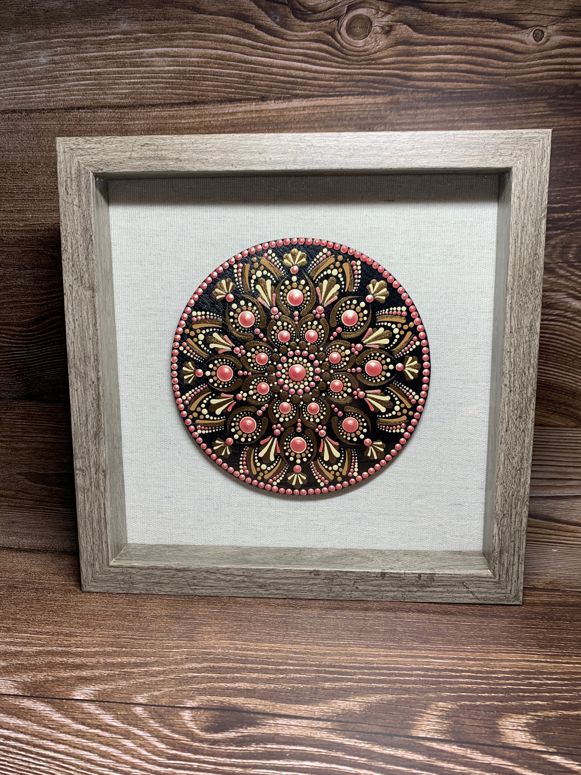 This hand painted dotted mandala was painted on a 6" round wood blank in shades of Pearl Pink, Cream, Tan and Espresso Brown Metallic on a black background, two coats of gloss varnish were added to the finished piece