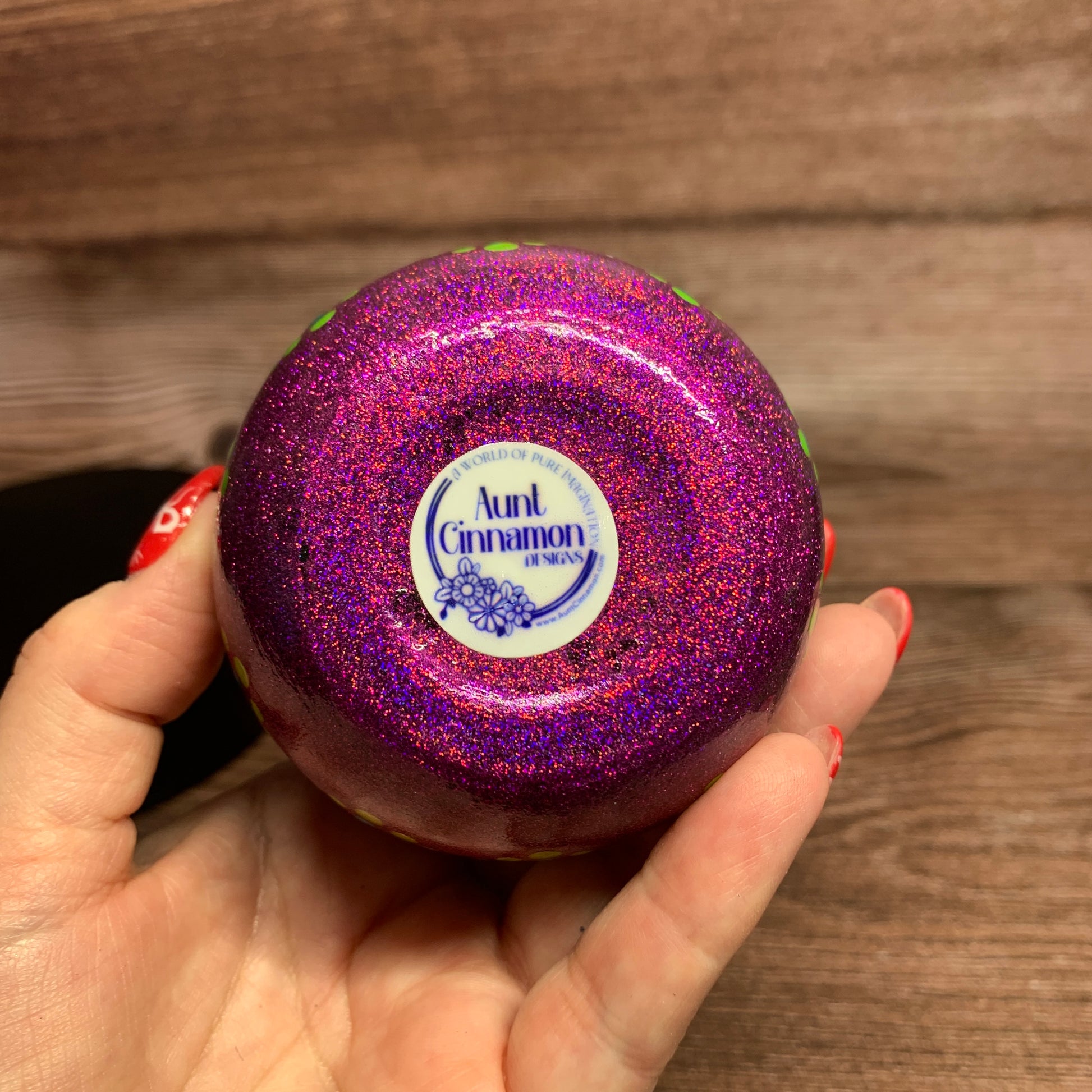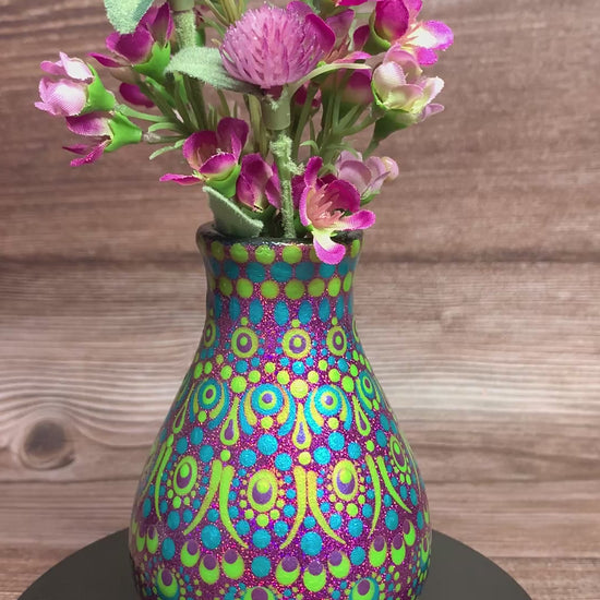 Add some sparkle to your decor with this mini Purple vase! Coated with "Cape Cod" glitter and hand painted with aqua green and purple accents, it's perfect for adding a pop of color to any room. The whimsical design will surely bring a smile to your face.