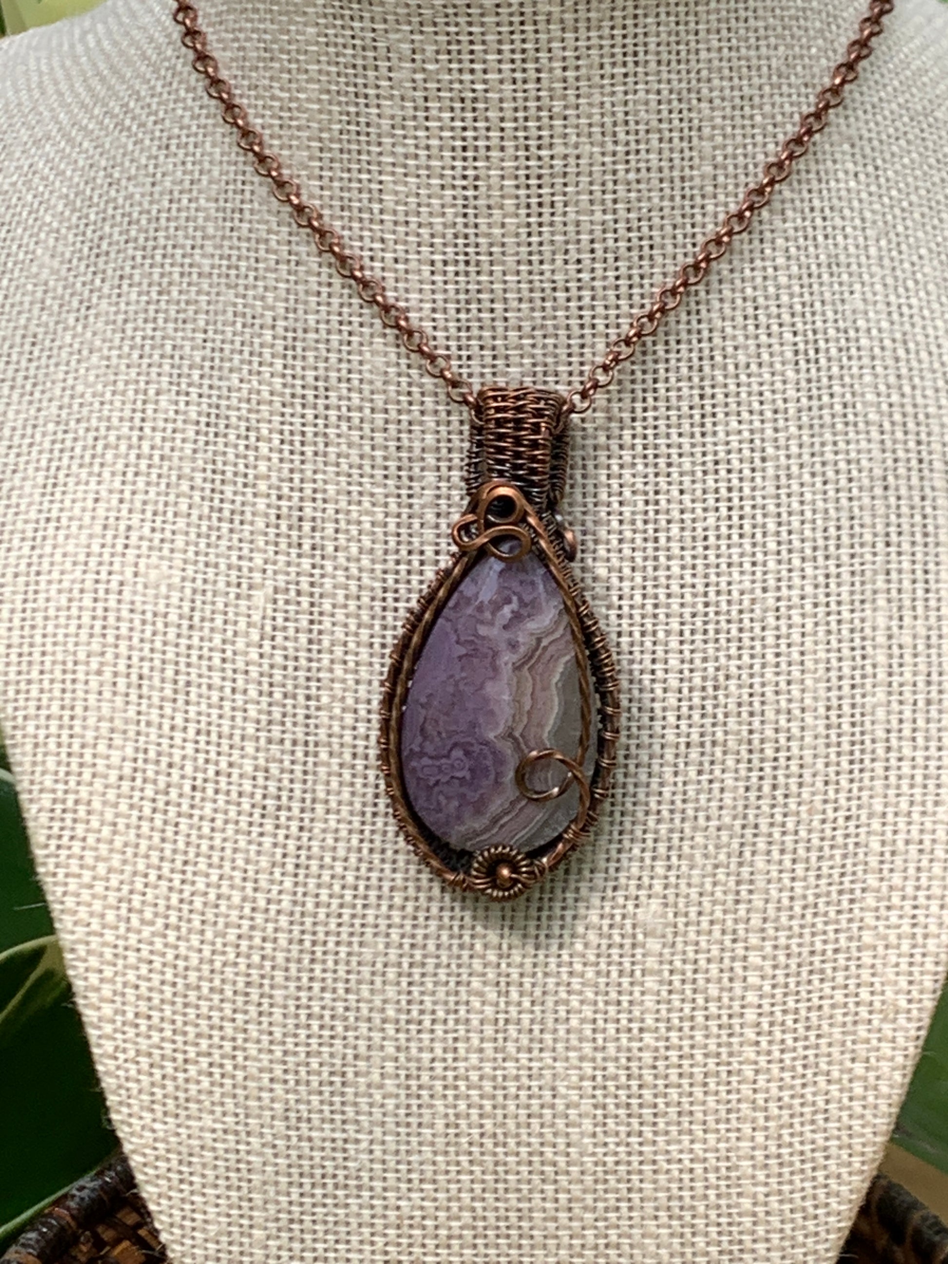This gorgeous pear shaped Royal Aztec Lace Agate has been wrapped in woven copper that has been patina’d to add warmth and depth to the copper weaving and bring out the beautiful colors or the stone.