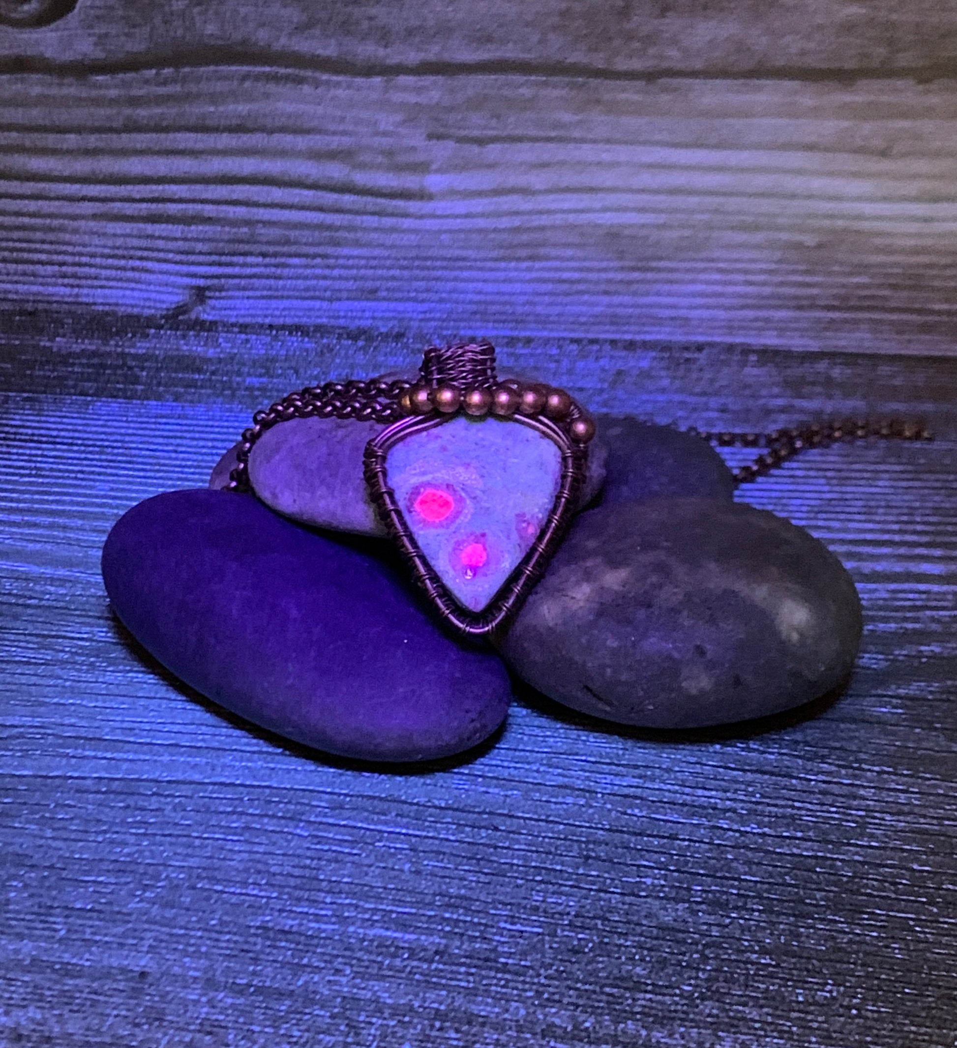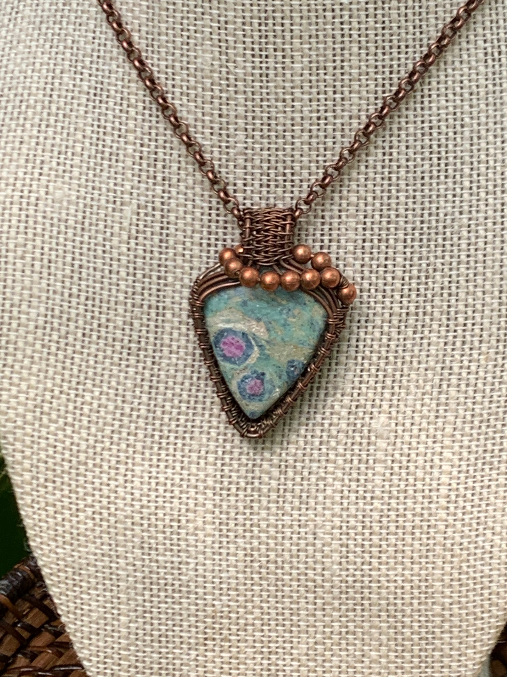 This Gorgeous stone has been wrapped in woven copper wire with a swoop of copper beads.