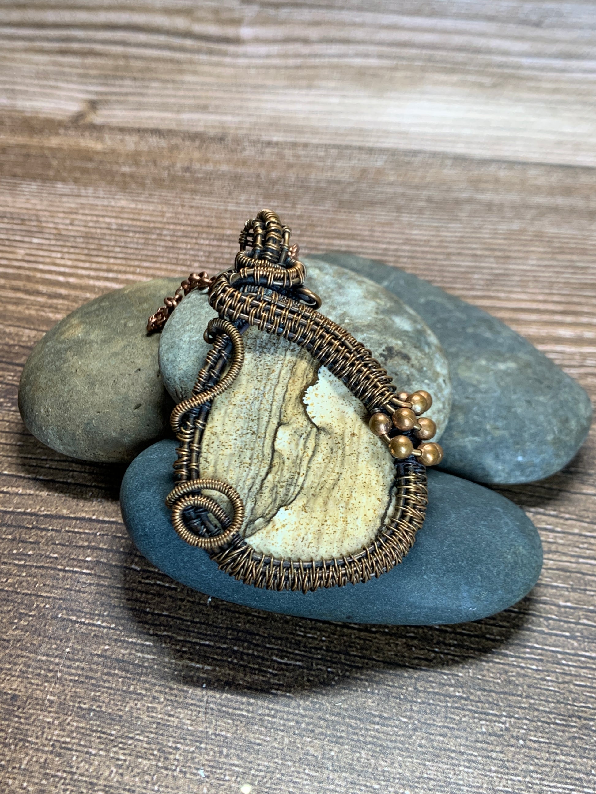 This Sea Sediment cabochon has been wrapped in woven copper that has been patina’d to add warmth and depth to the copper and accentuate the beautiful color of the Stone.