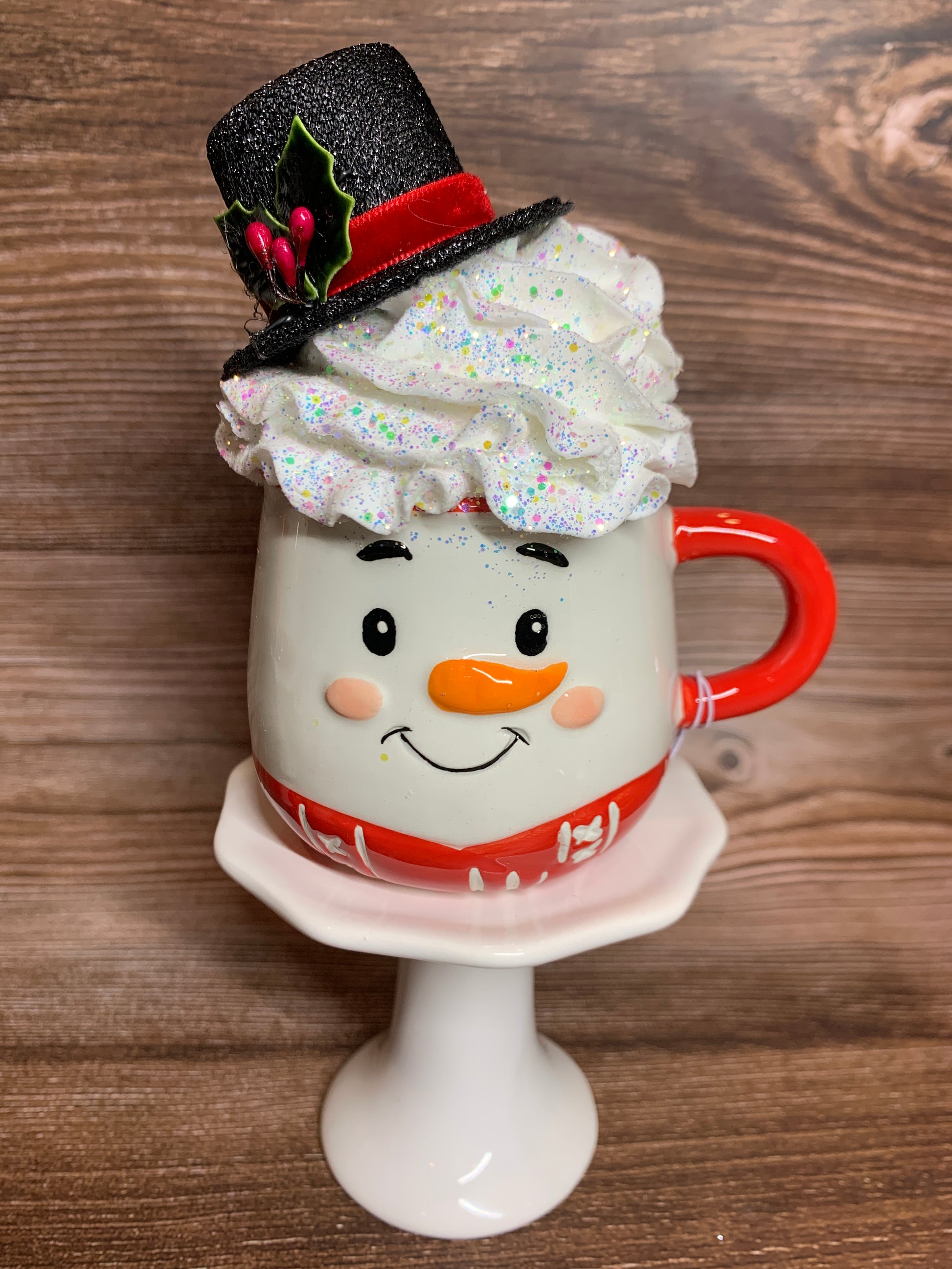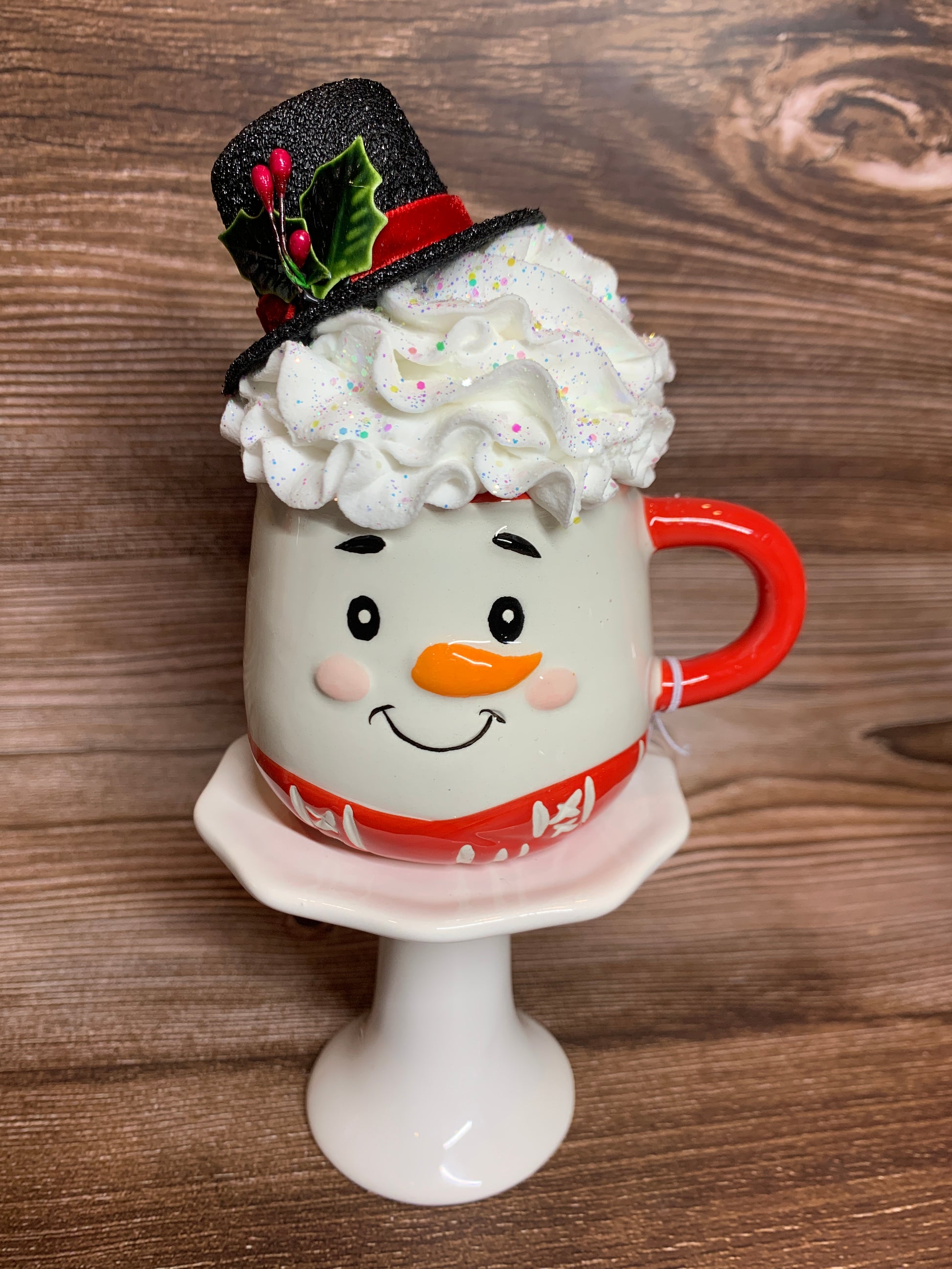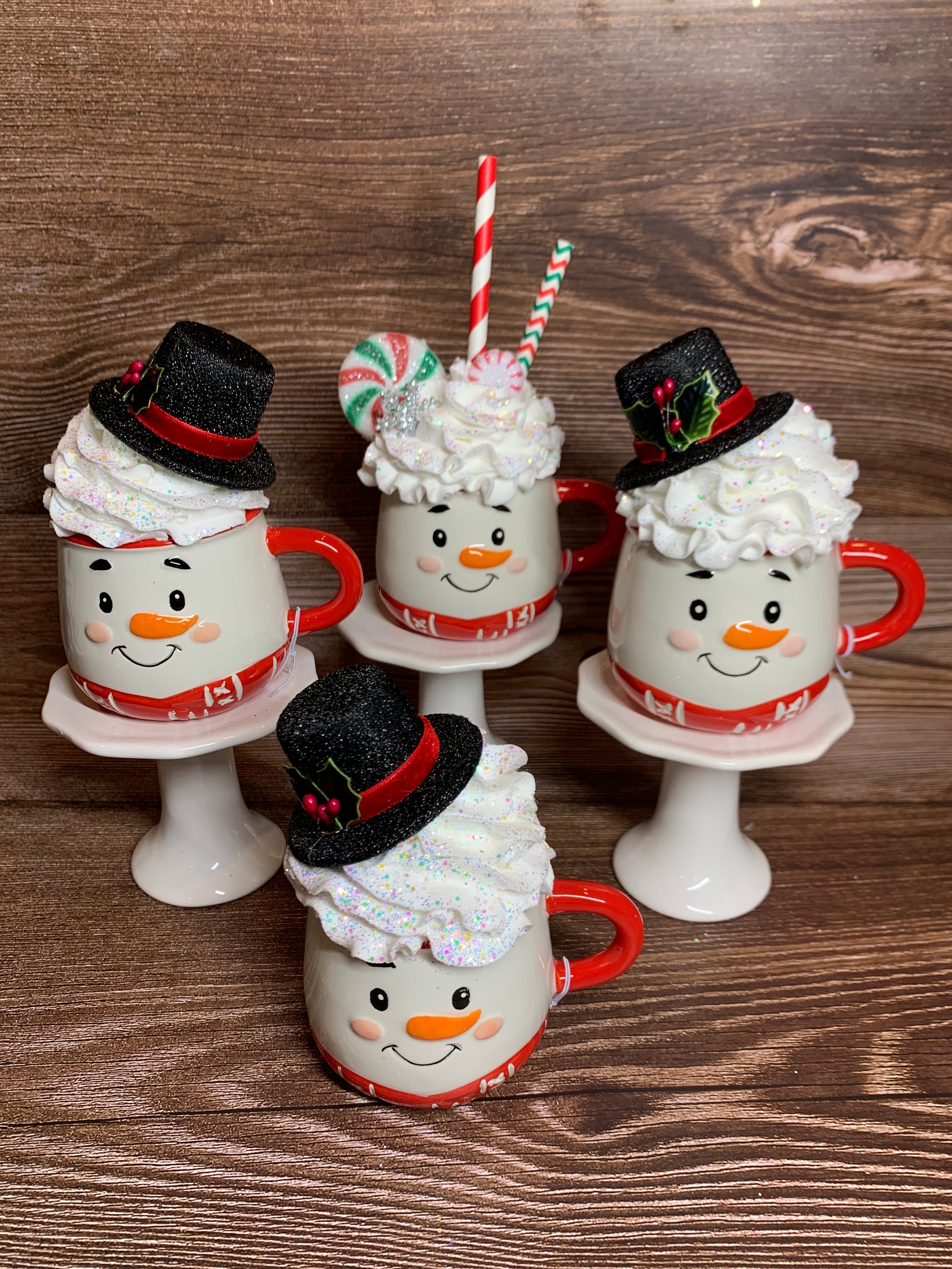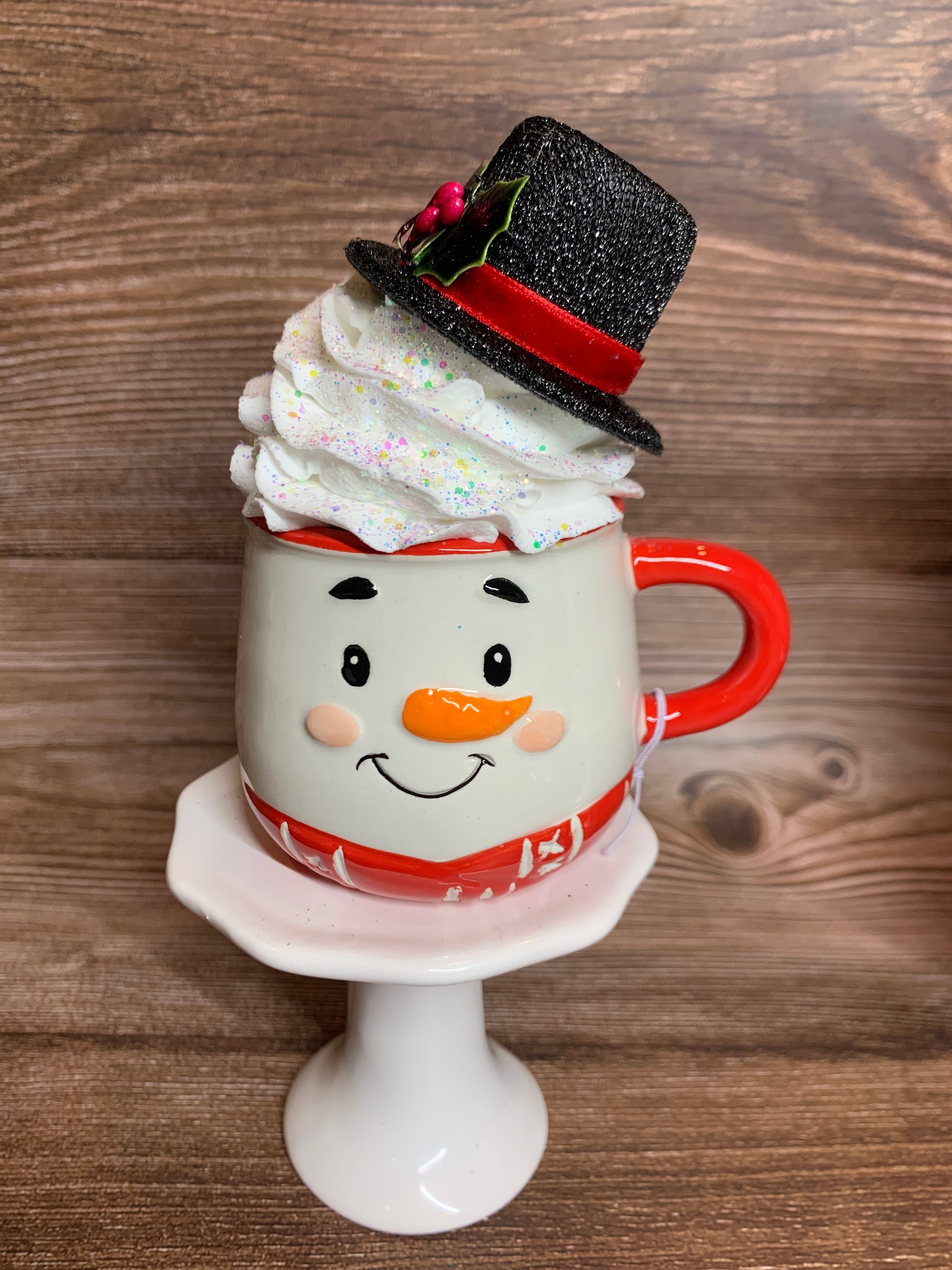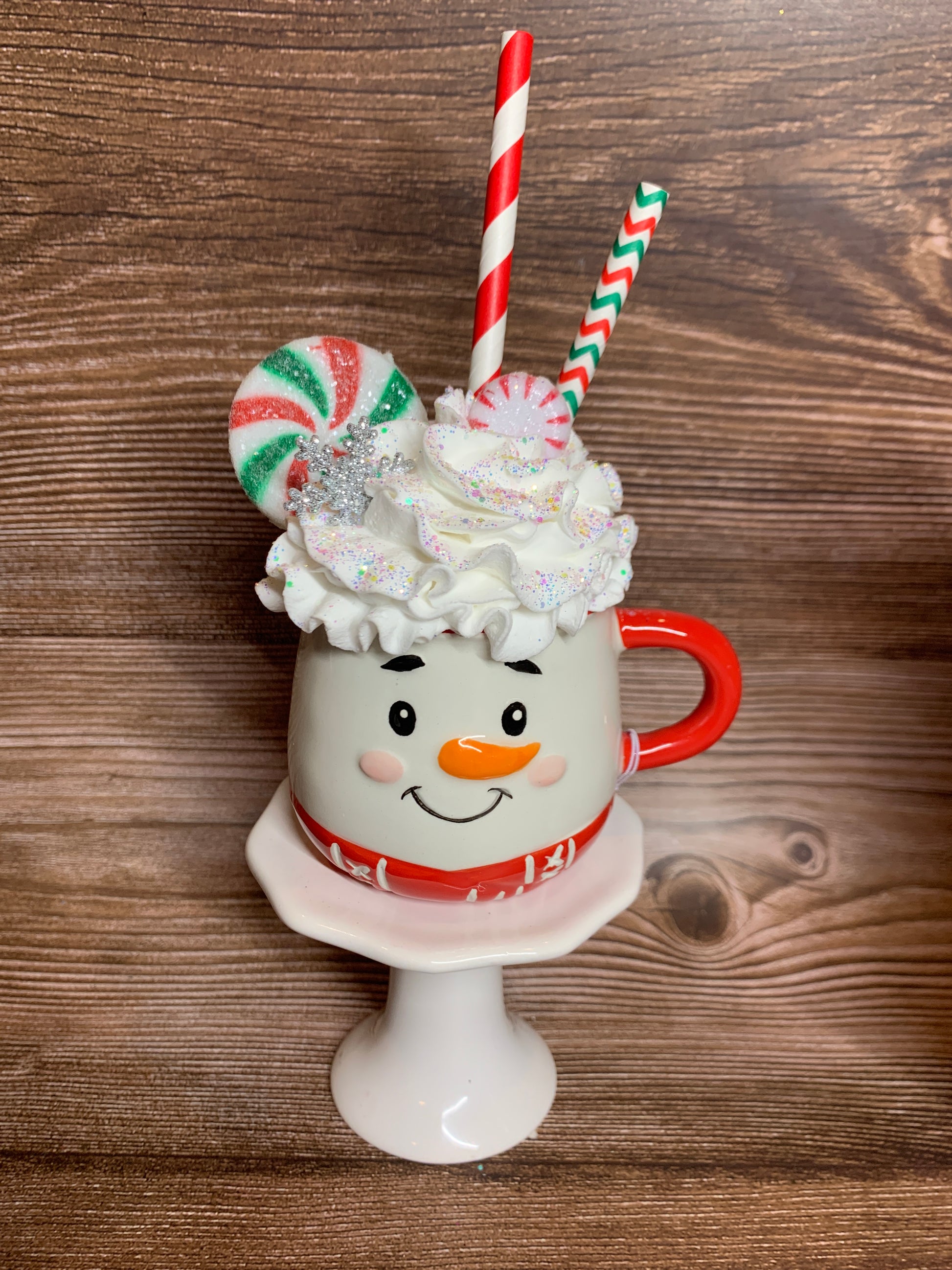 Add a touch of holiday charm to your tiered tray decor with these adorable ceramic Snow Man Mini Mugs! Each mug is filled with faux whipped cream, sprinkled with glitter, and comes with either a hat or peppermint and straw. Perfect for adding a fun and festive touch to your home this season!