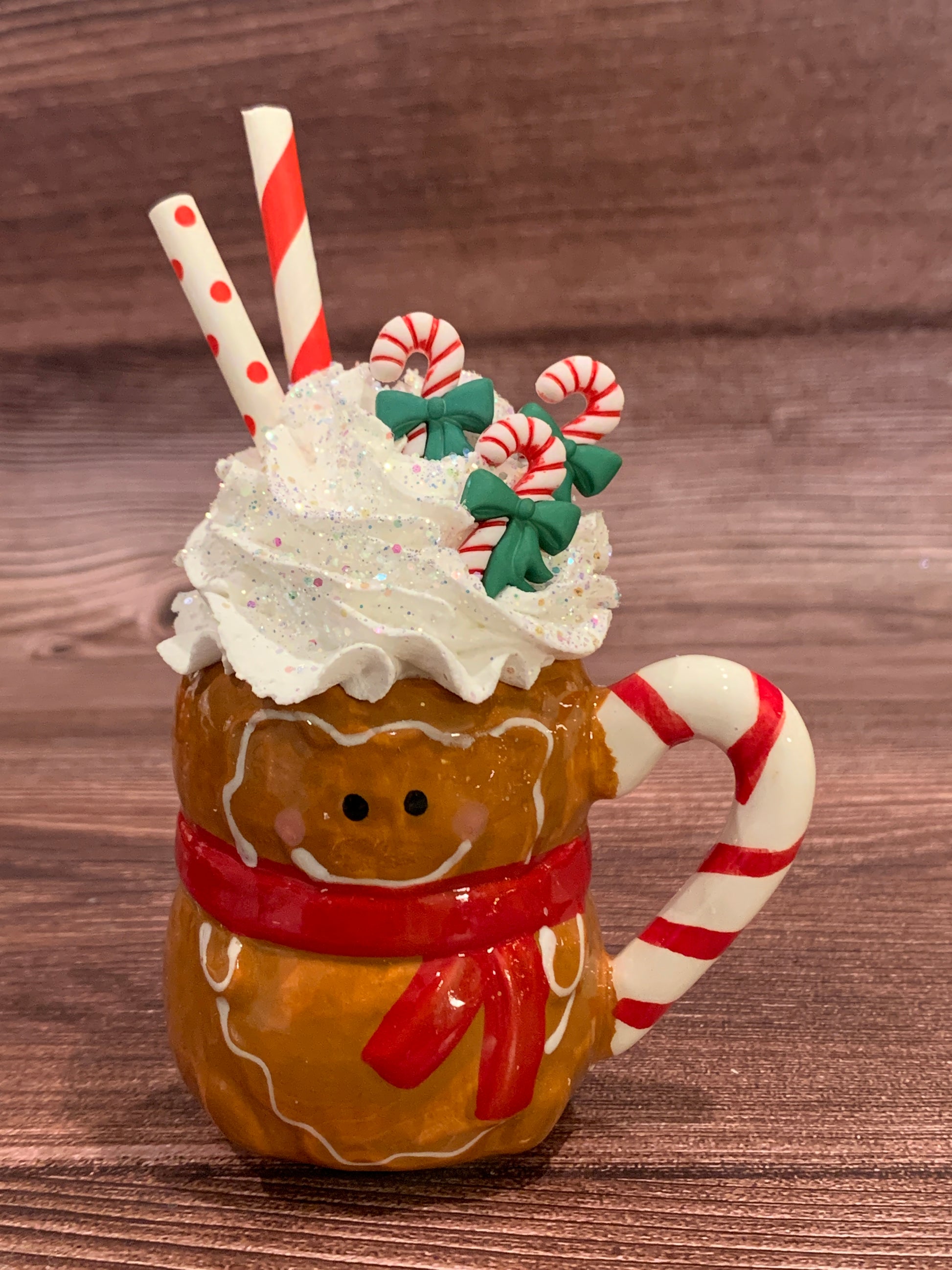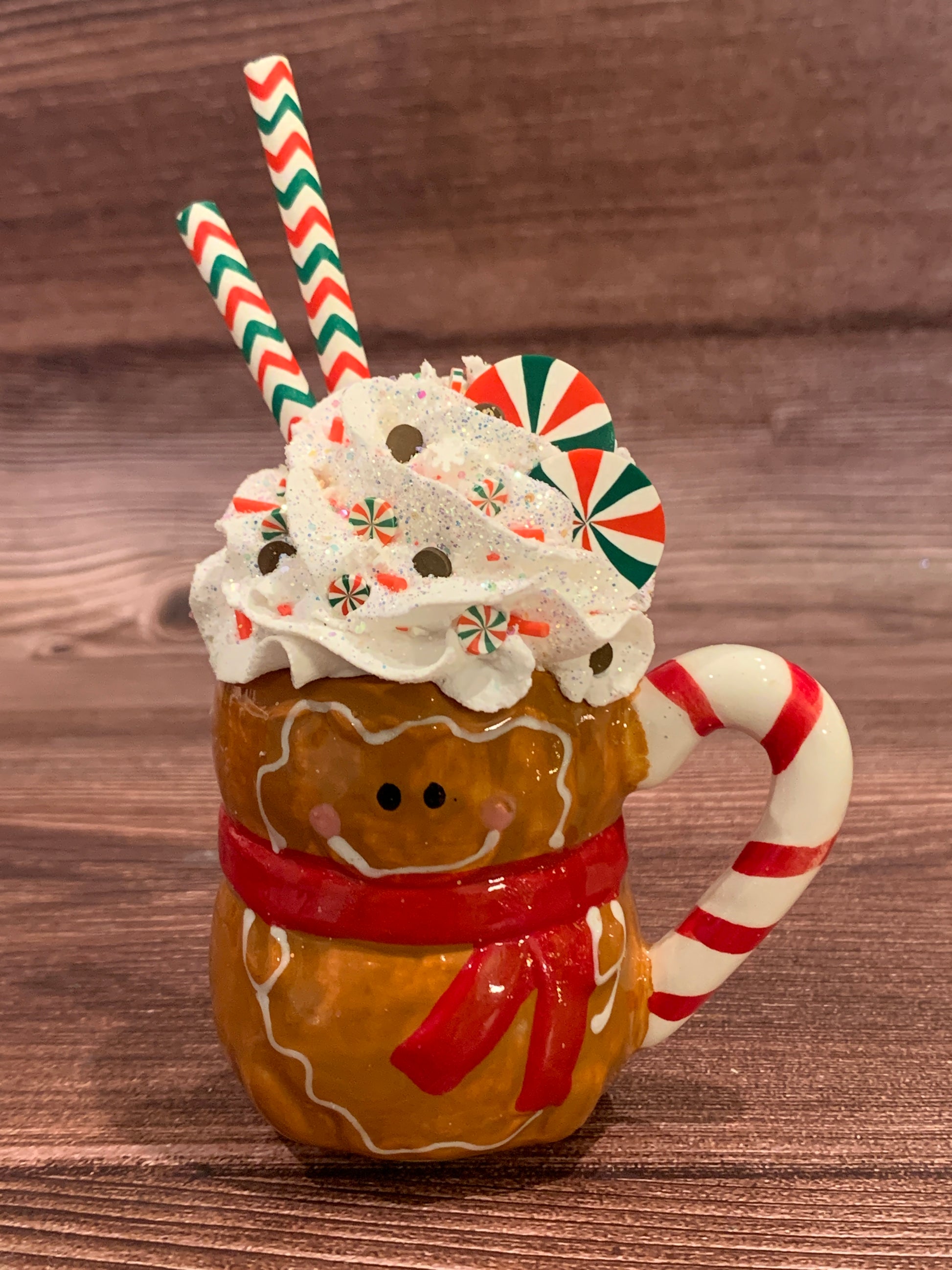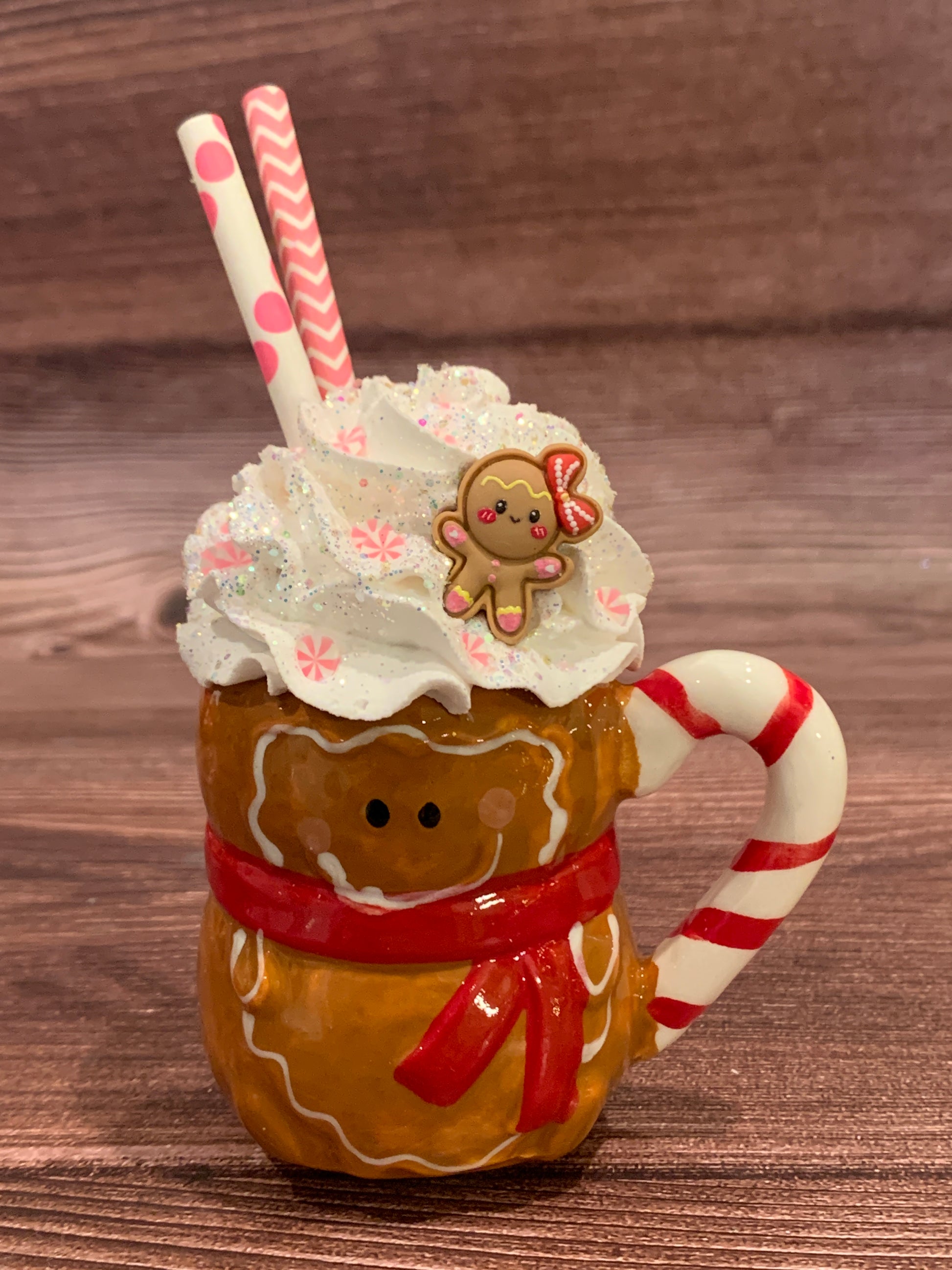 Add some festive charm to your Christmas décor with this Ginger Bread mini mug! Crafted from ceramic, it features a whimsical design with a red scarf and striped handle. Plus, it comes filled with faux whipped cream for a deliciously adorable touch. Perfect for tier trays, this mug is a must-have for the holiday season.