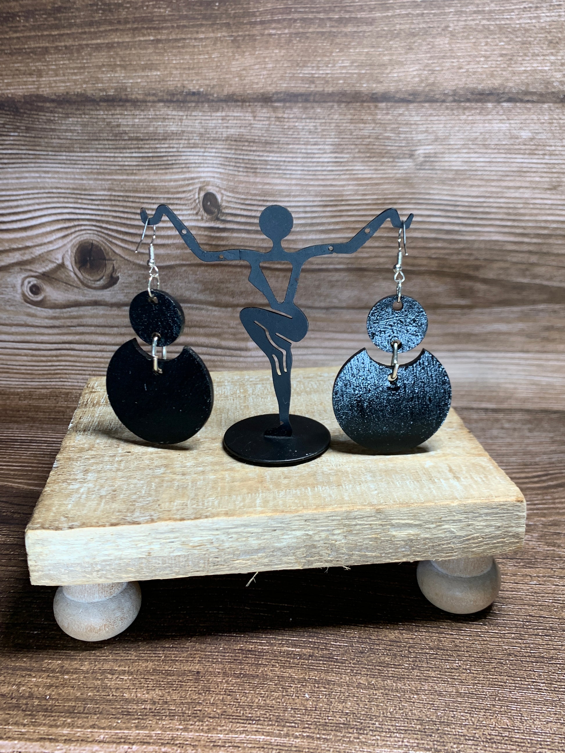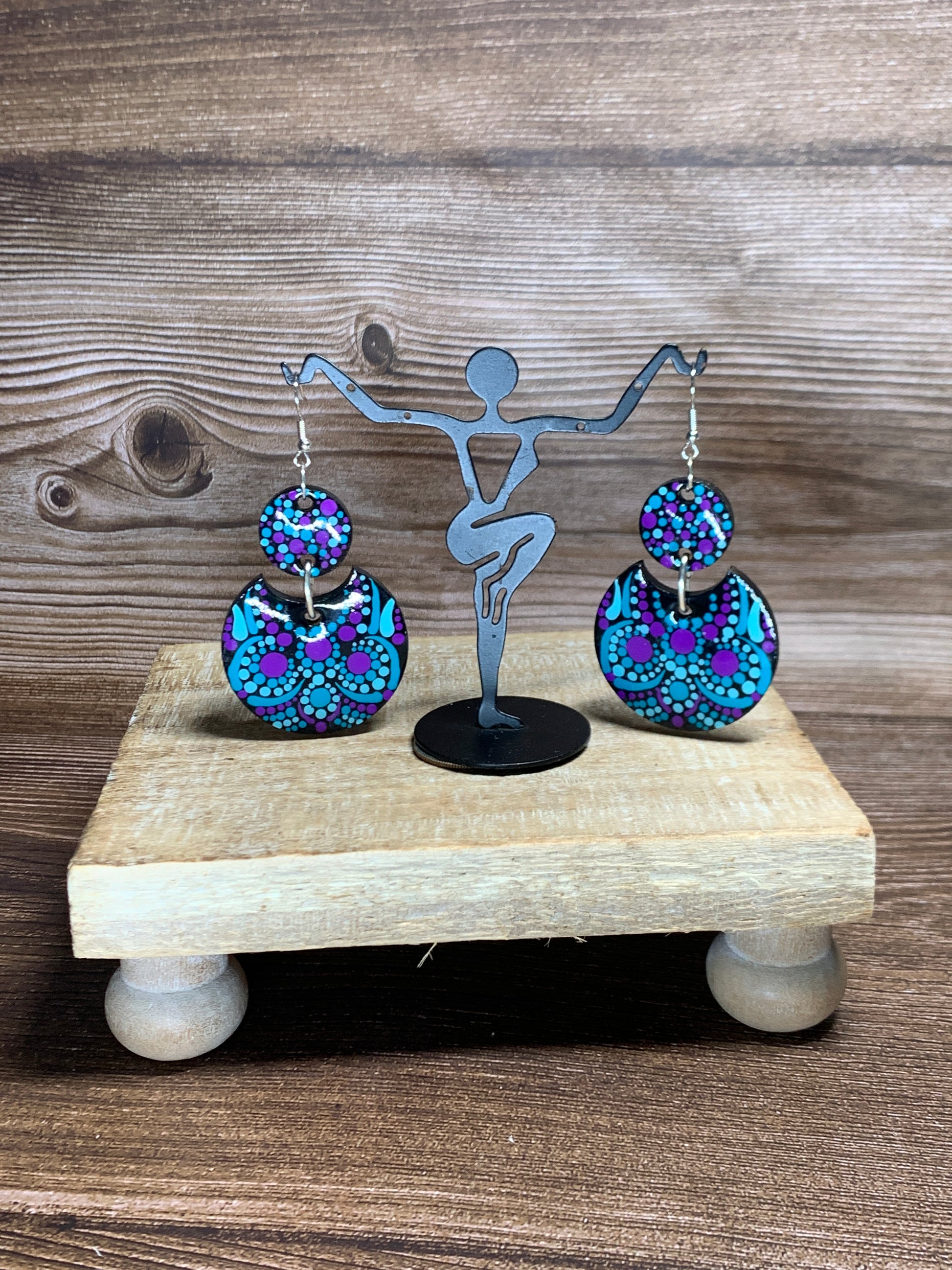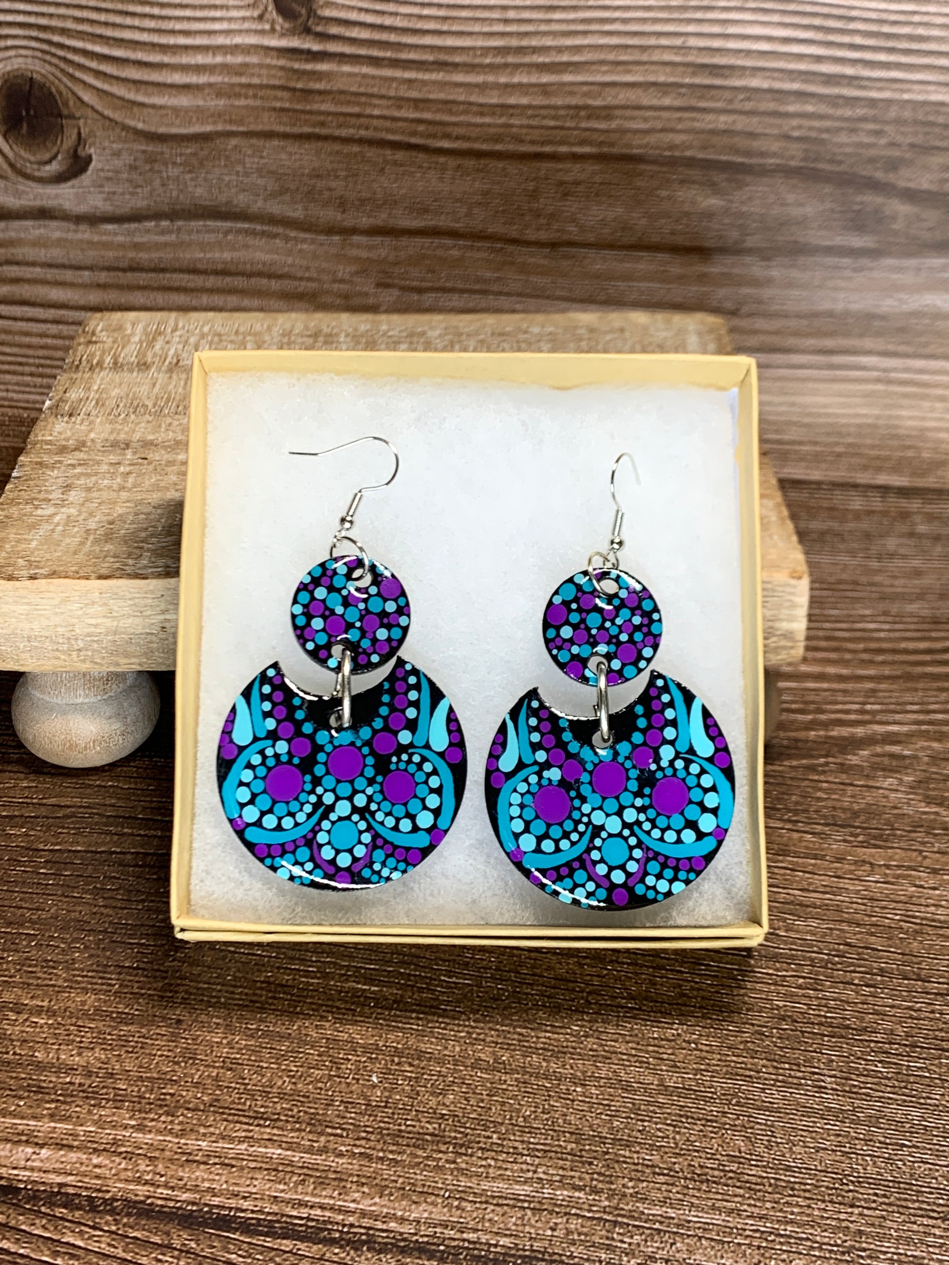 I Hand Dotted these 1/8" Wood Earrings using Teal, Aqua and Purple Acrylic paint.