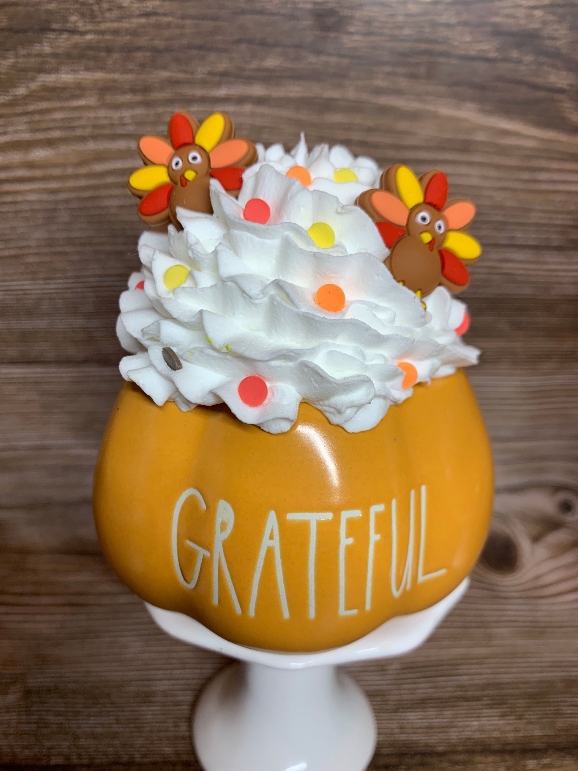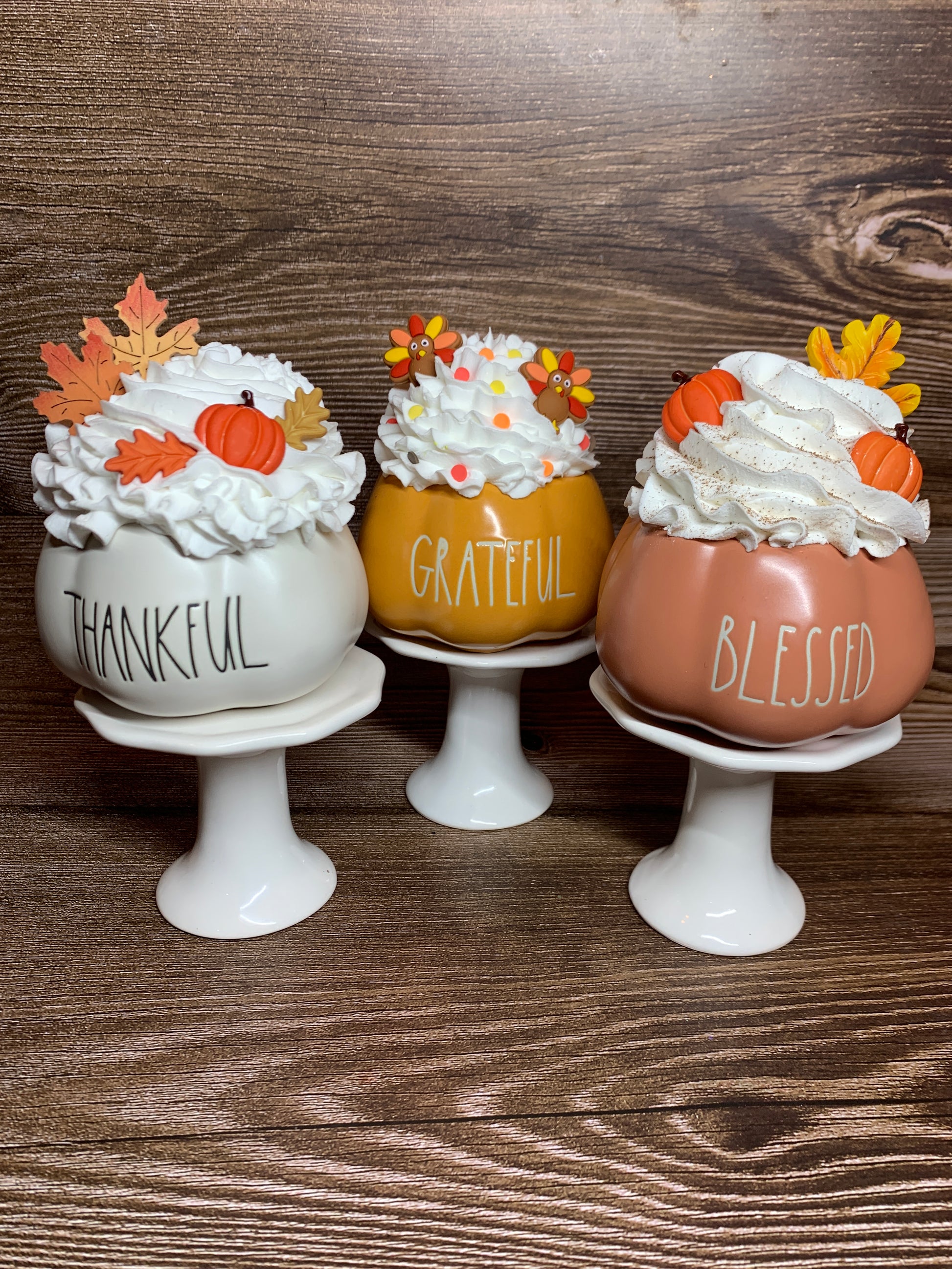 These cute little dishes are shaped like pumpkins and were crafted by a famous maker. They come filled with fake whipped cream and are decorated for the season, making them ideal for tier trays or as a festive addition to your Thanksgiving table.
