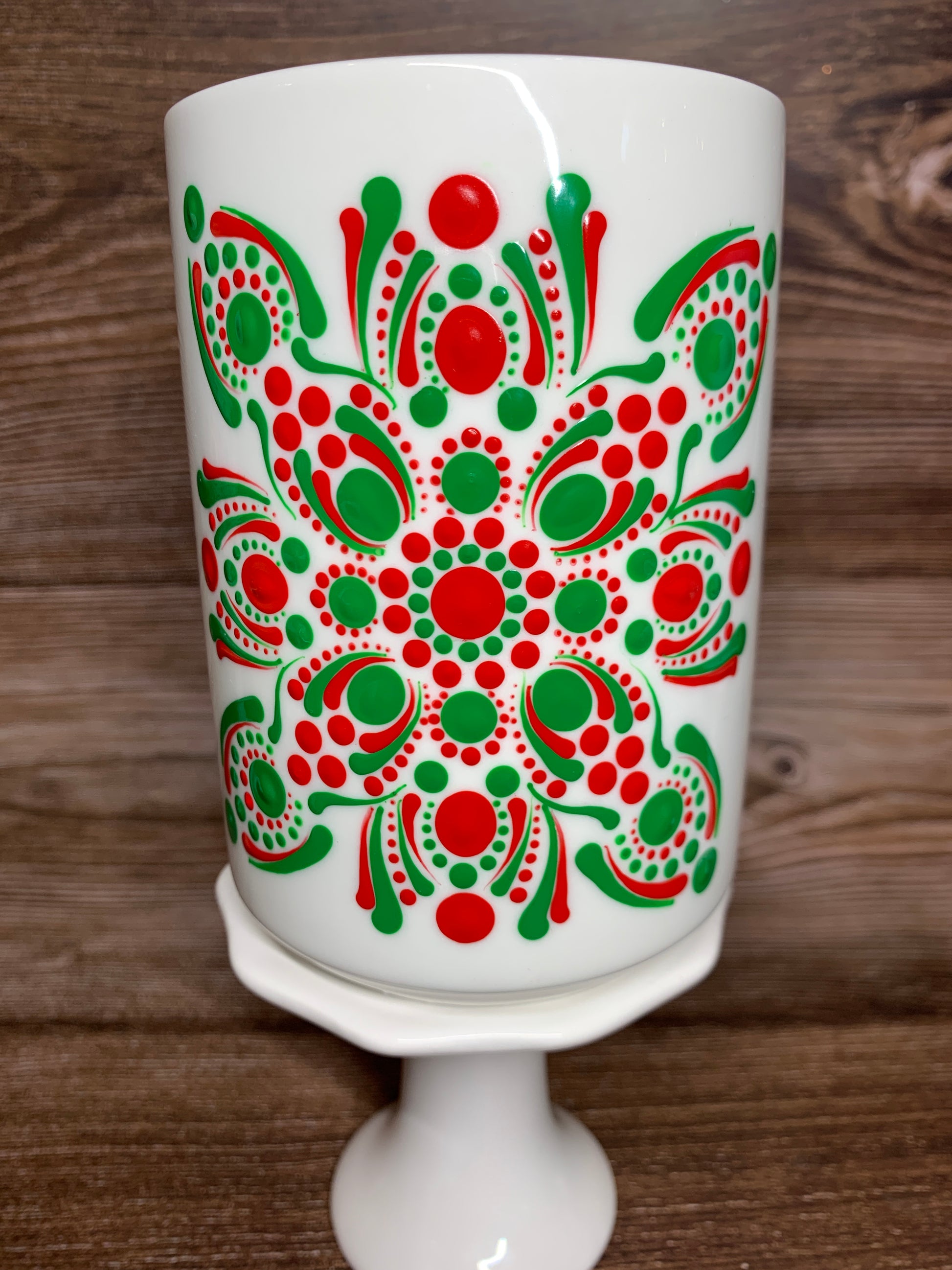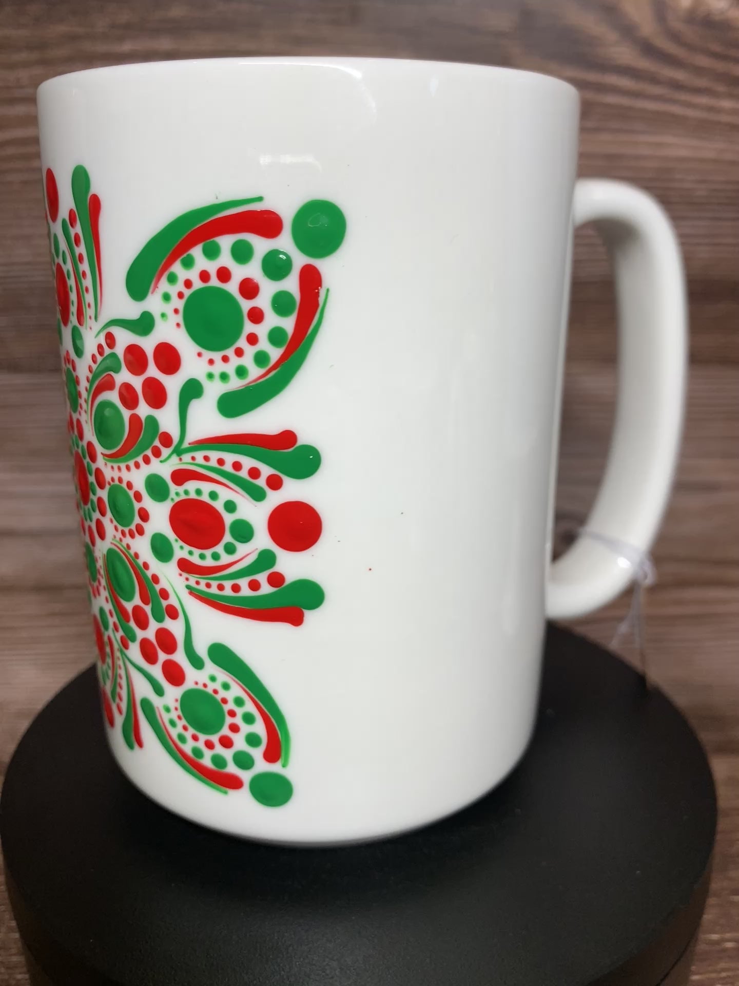 "Add some fun to your morning coffee with this white mug! Featuring a large handle for easy grip and a unique red and green dot art design, this mug is perfect for jazzing up your kitchenware collection."